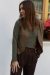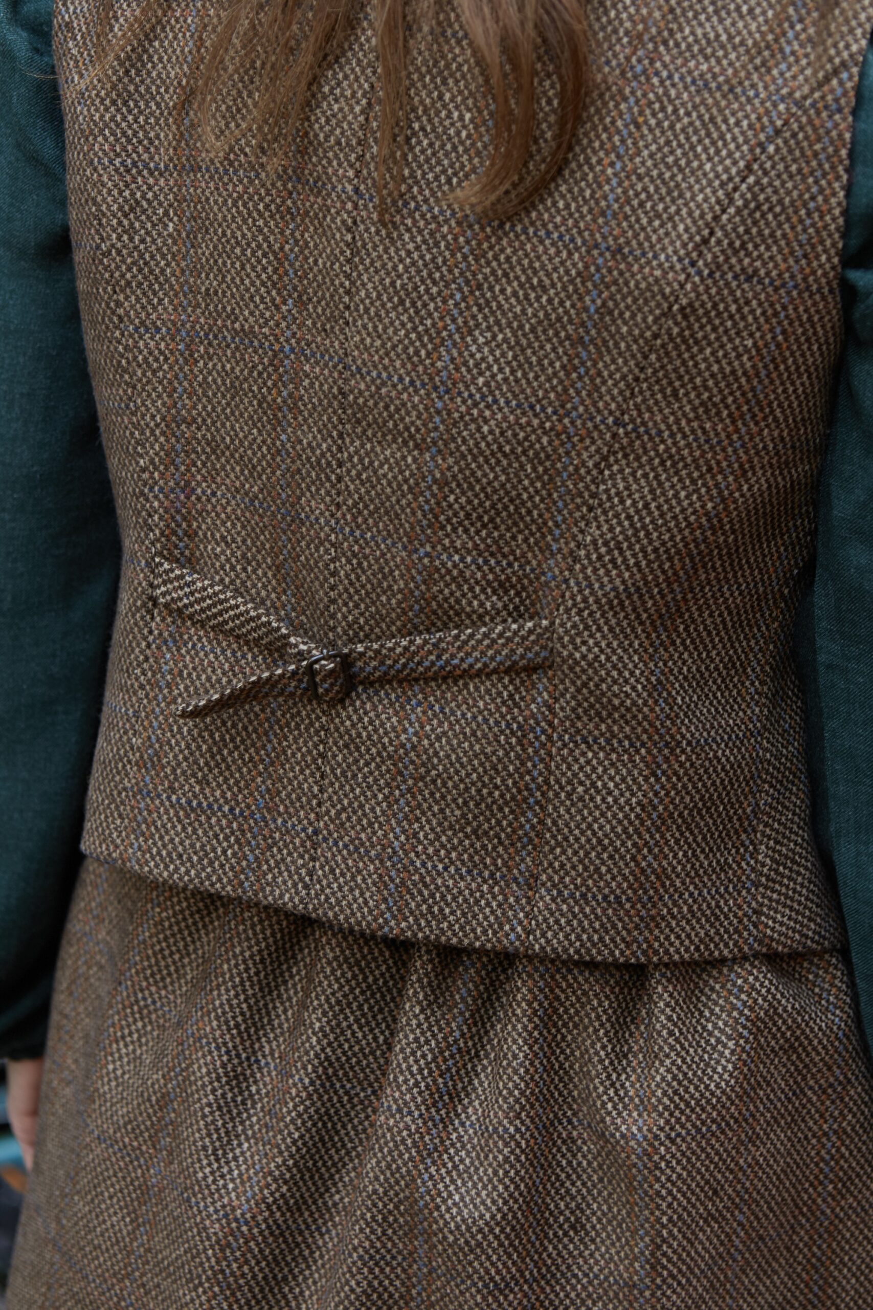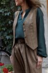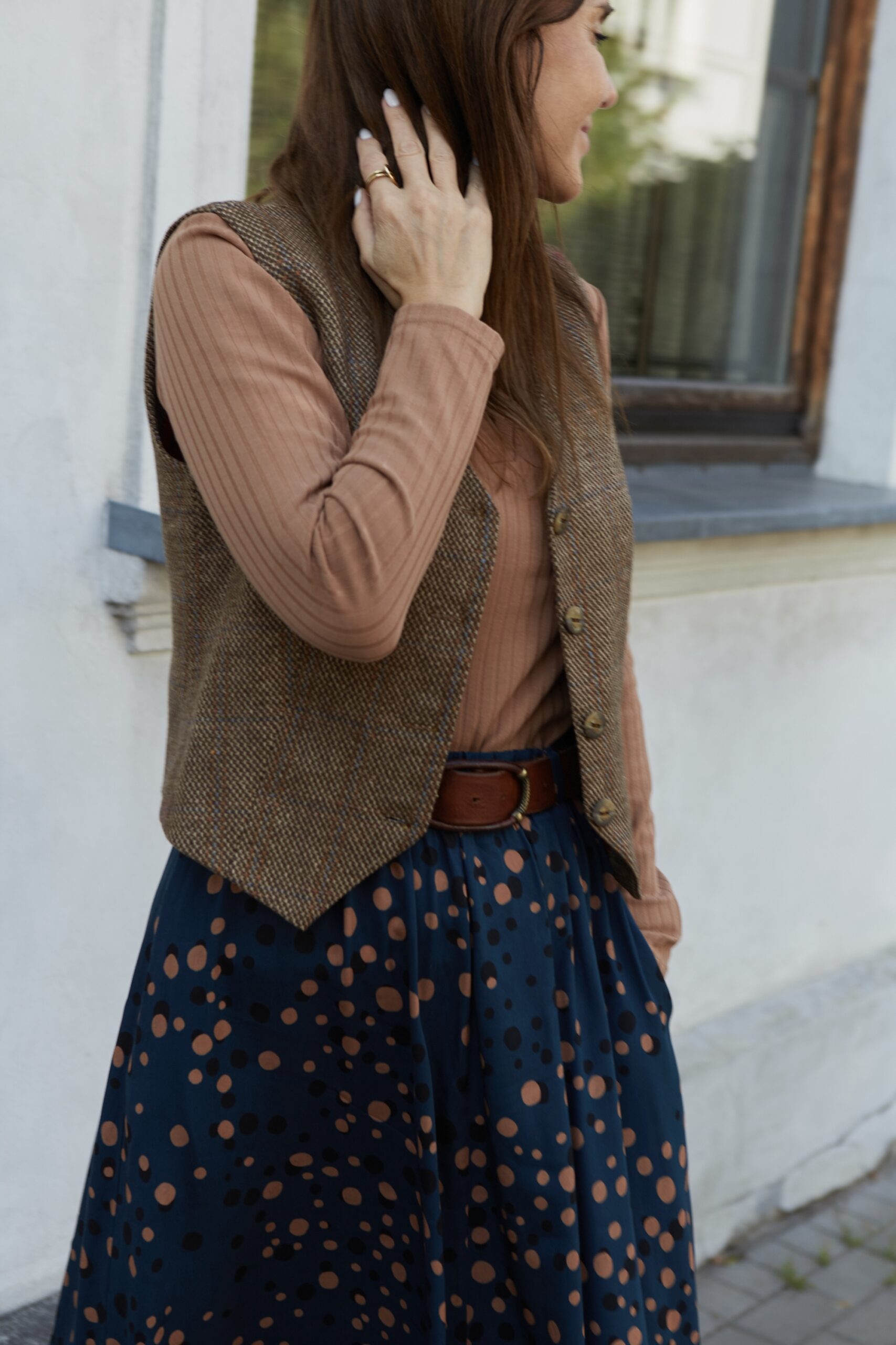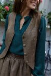 Kamizelka o klasycznym kroju, uszyta z wysokogatunkowej, ciepłej wełny w kolorze beżowym na wiskozowej podszewce. Idealnie skrojona i perfekcyjnie uszyta. Można ją nosić zapiętą lub rozpiętą. Z tyłu regulowana. Jest idealnym uzupełnieniem każdej stylizacji. Pasuje zarówno do spodni, jak i spódnic.  To model, który znakomicie prezentuje się z prostymi jeansami, jak i z zawadiacką rozkloszowaną spódnicą. Naturalny materiał sprawia, że kamizelka świetnie nadaje się na każdą porę roku. Występuje w trzech rozmiarach XS/S, M oraz L. Wyprodukowana w Polsce, w kameralnej pracowni pod Warszawą. Idealna do kompletu ze spódnicą Iris Beż Bis. Garmatura wełny: 280 g/m2.