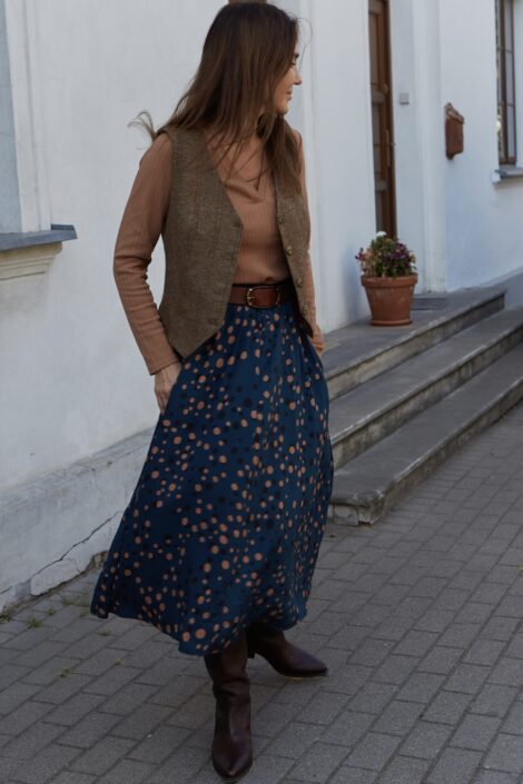 Kobieca, wiskozowa spódnica o długości midi w kolorze niebieskim w drobne cętki w kolorze błękitnym. Doskonale modeluje sylwetkę, akcentując talię. Dzięki wygodnej gumie dopasowuje się do rozmiaru od S do L. Dodatkowym atutem są także praktyczne kieszenie. Lekka spódnica z wiskozy jest doskonałym wyborem na każdą porę roku. Świetnie komponuje się zarówno z botkami, kozakami, jak i butami sportowymi. Łączona jest też ze szpilkami oraz oficerkami. Spódnica Adara to model, który pomoże Ci wydobyć Twój naturalny blask. Uszyta w Polsce, w kameralnej pracowni na warszawskiej Pradze.