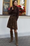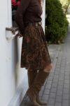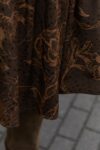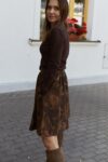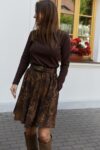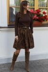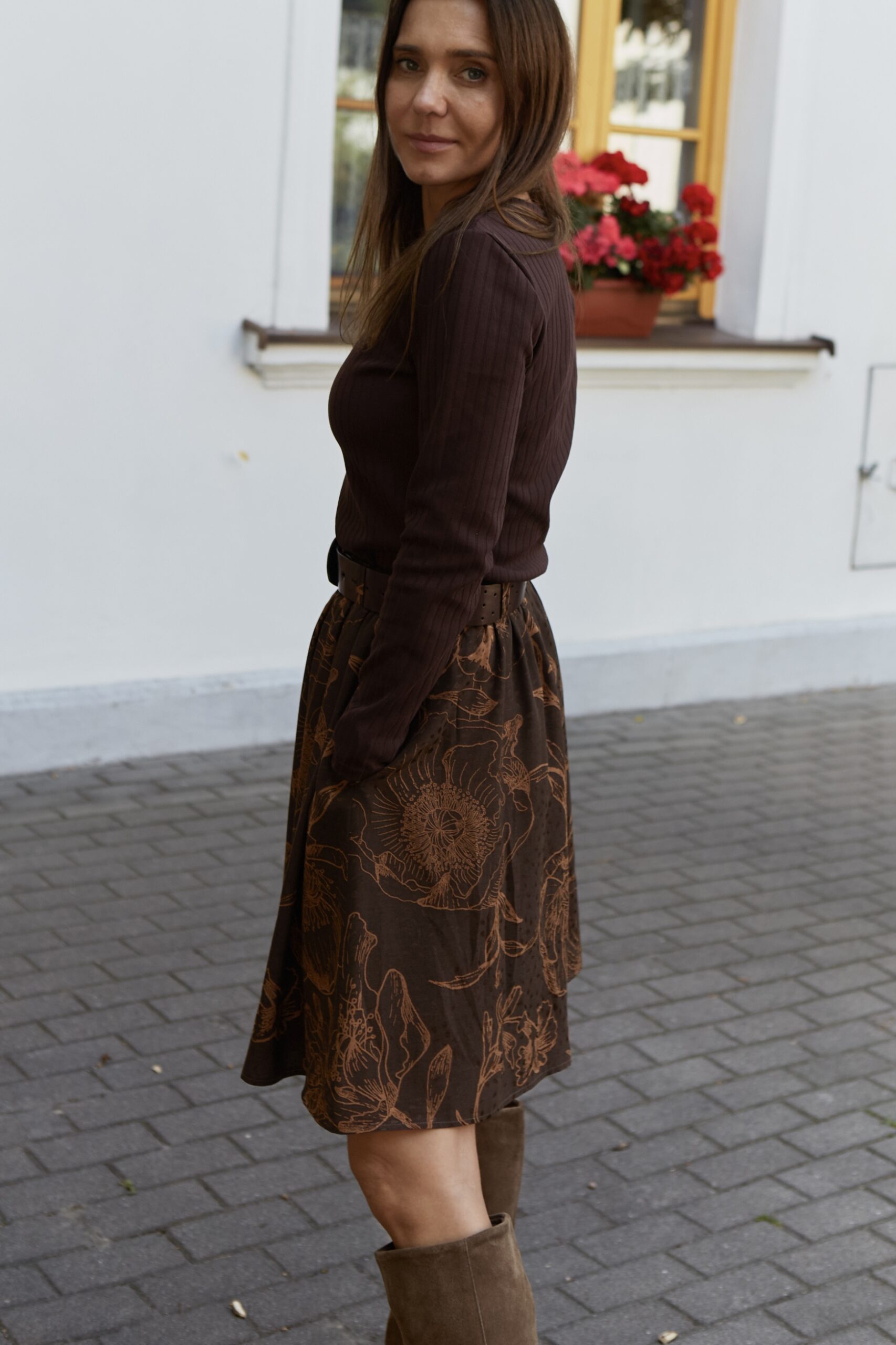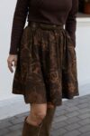 Kobieca, wiskozowa spódnica o długości przed kolano w kolorze ciemnego brązu w kamelowy wzór. Doskonale modeluje sylwetkę, akcentując talię. Dzięki wygodnej gumie dopasowuje się do rozmiaru od S do L. Dodatkowym atutem są także praktyczne kieszenie. Lekka spódnica z wiskozy jest doskonałym wyborem na każdą porę roku. Świetnie komponuje się zarówno z botkami, kozakami, jak i butami sportowymi. Łączona jest też ze szpilkami oraz oficerkami. Występuje w jednym rozmiarze. Spódnica Adara to model, który pomoże Ci wydobyć Twój naturalny blask. Uszyta w Polsce, w kameralnej pracowni na warszawskiej Pradze.