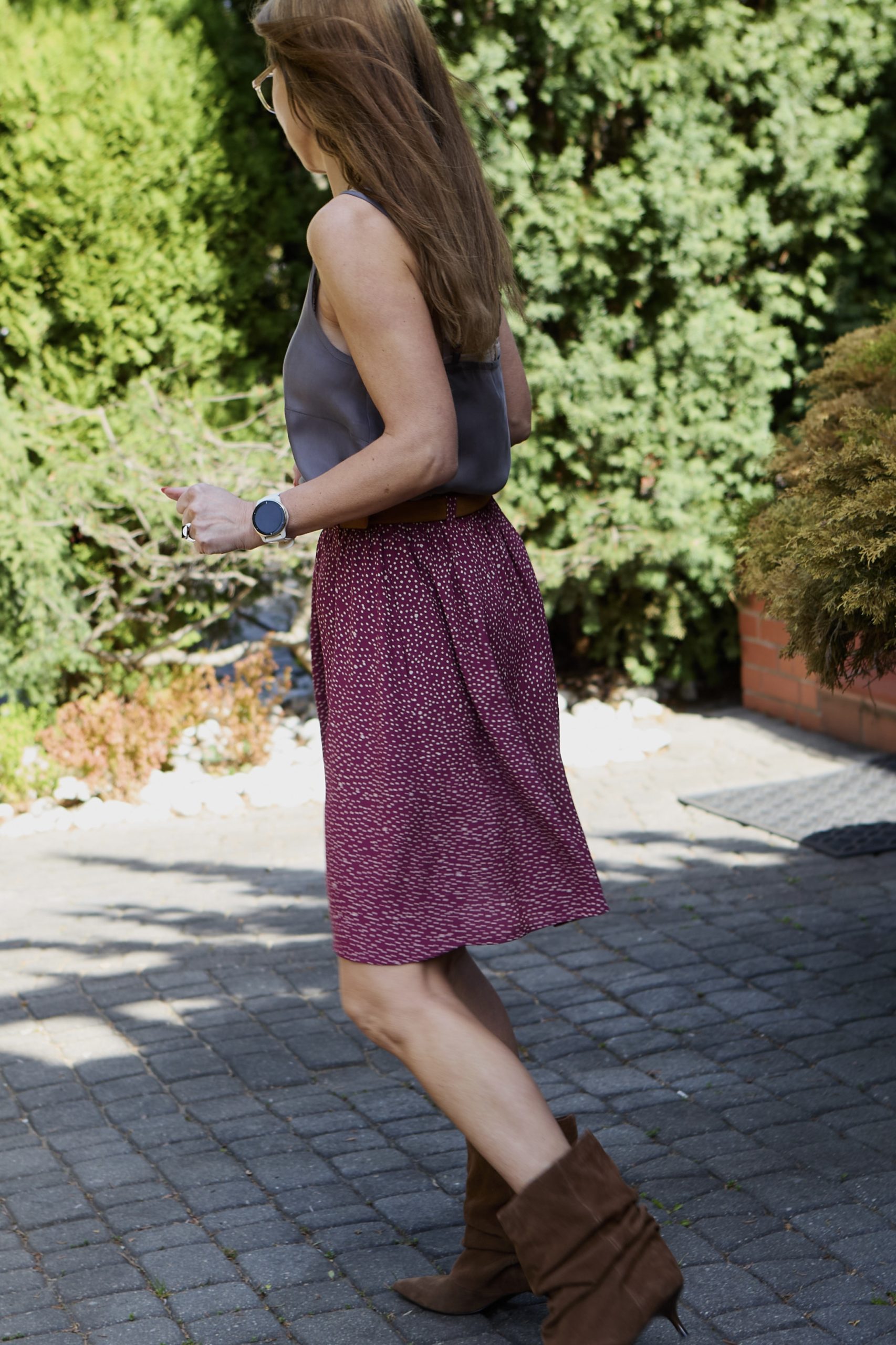 Kobieca, wiskozowa spódnica o długości przed kolano w kolorze zgaszonego fioletu w drobne, nieregularne centki w kolorze beżowym uszyta z wysokiej jakości wiskozy. Doskonale modeluje sylwetkę, akcentując talię. Dzięki wygodnej gumie dopasowuje się do rozmiaru od S do L. Dodatkowym atutem są także praktyczne kieszenie. Lekka spódnica z wiskozy jest doskonałym wyborem na każdą porę roku. Świetnie komponuje się zarówno z botkami, klapkami jak i butami sportowymi. Spódnica Adara to model, który pomoże Ci wydobyć Twój naturalny blask. Uszyta w Polsce, w kameralnej pracowni na warszawskiej Pradze. Pasek jest częścią stylizacji i nie jest sprzedawany w komplecie ze spódnicą.
