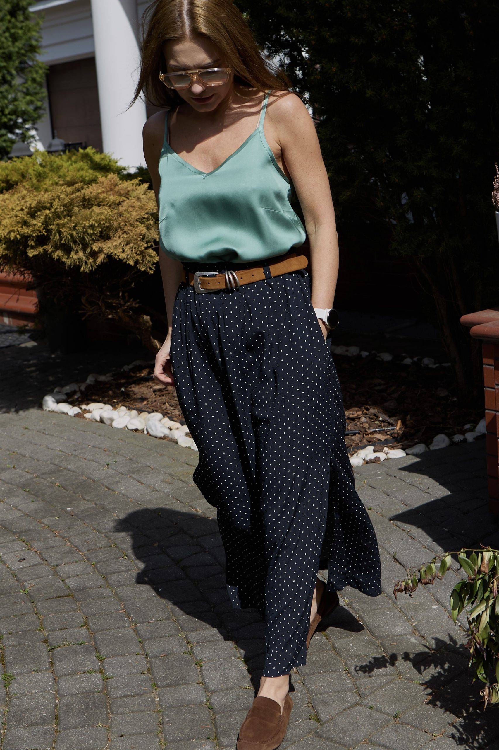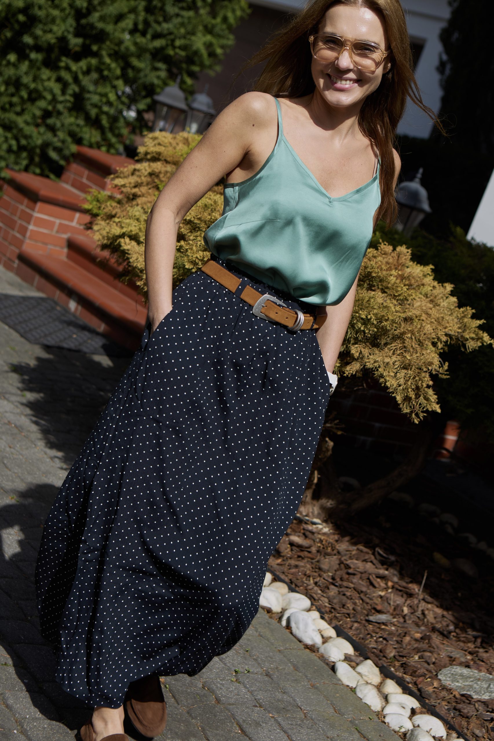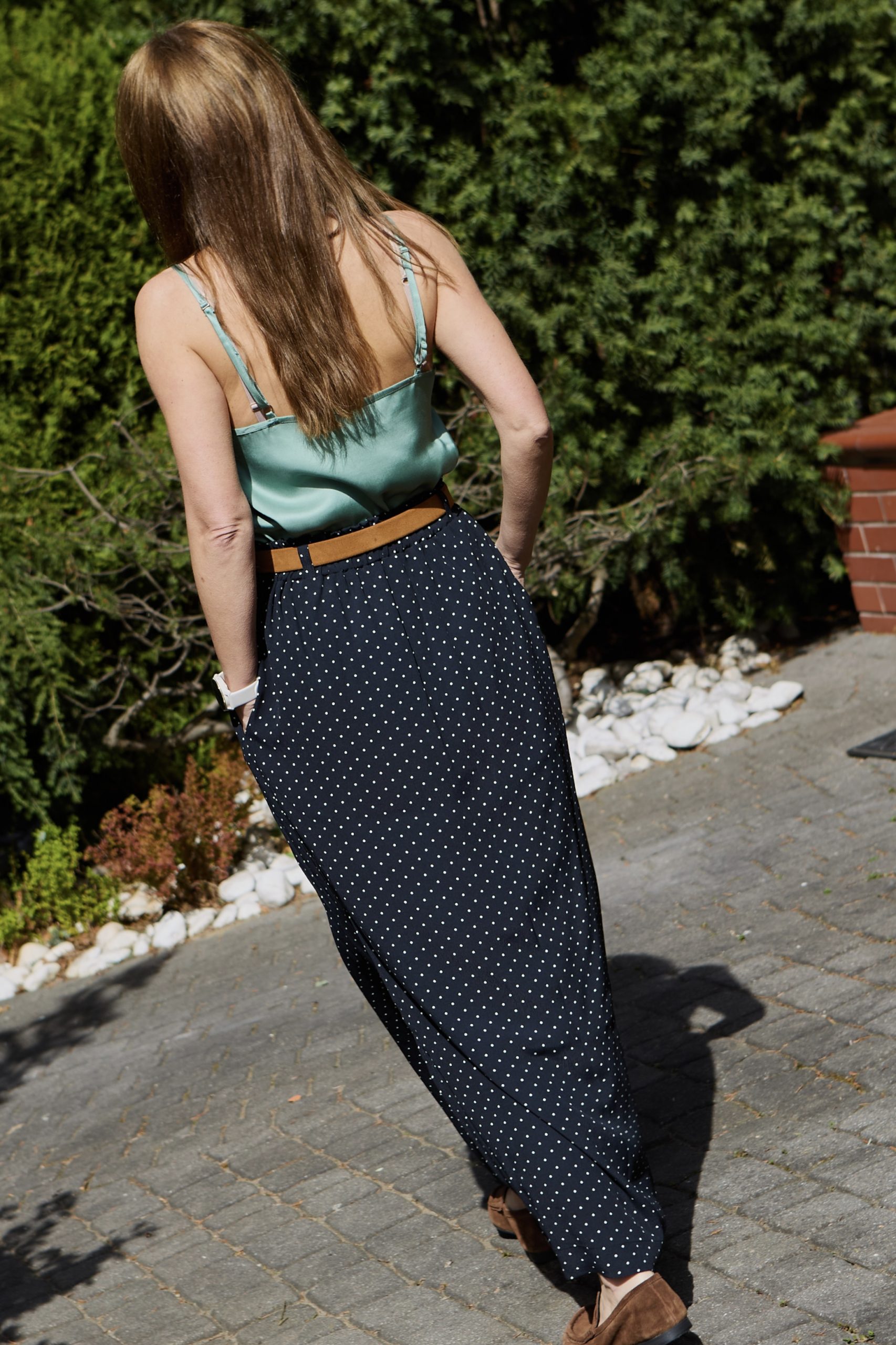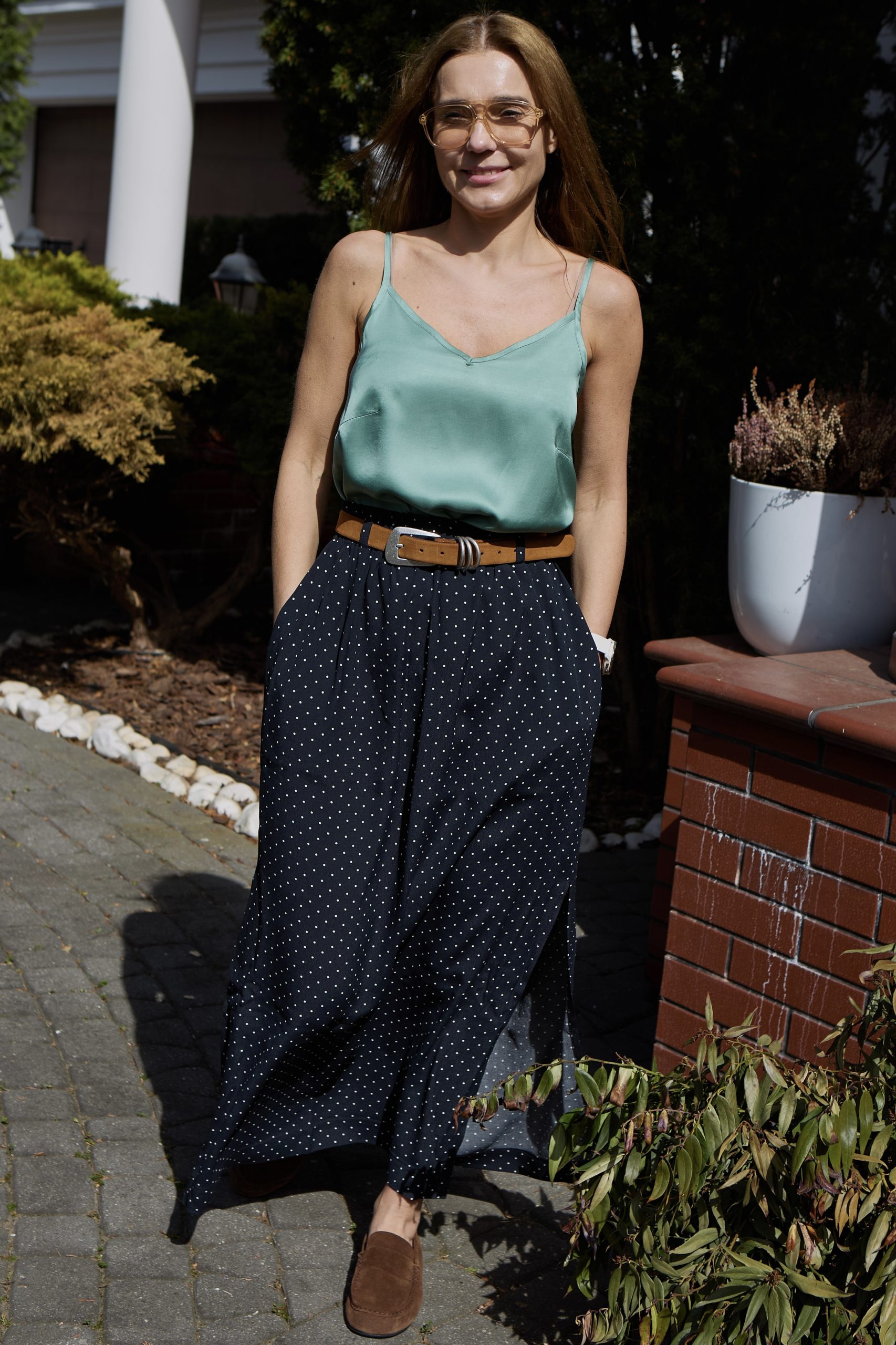 Spódnica Hugo to model spódnicy o długości MAXI. Po bokach spódnica posiada dwa rozporki, co dodaje jej lekkości. Ta wiskozowa spódnica w kolorze czarnym w białe kropki modeluje sylwetkę, akcentując talię. Dzięki wygodnej gumie możesz mieć pewność, że spódnica będzie pasowała do Twojego ciała. Dodatkowym atutem są także praktyczne kieszenie. Lekka spódnica z wiskozy jest doskonałym wyborem nie tylko na lato ale również na inne pory roku, w zależności od obuwia i dodatków. Świetnie komponuje się zarówno z botkami, kozakami, jak i butami sportowymi, klapkami, sandałami. Łączona jest też ze szpilkami. Uszyta w Polsce, w kameralnej pracowni na warszawskiej Pradze.