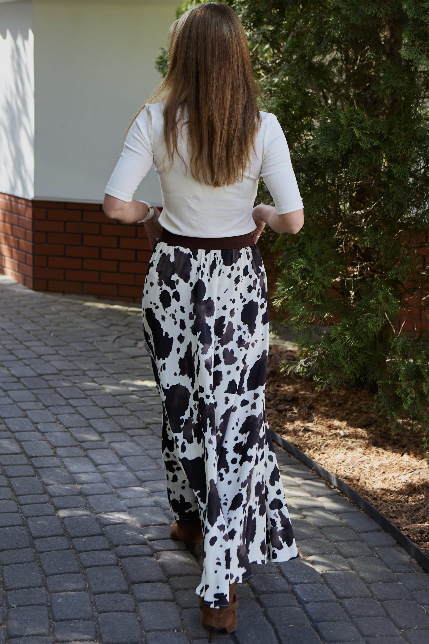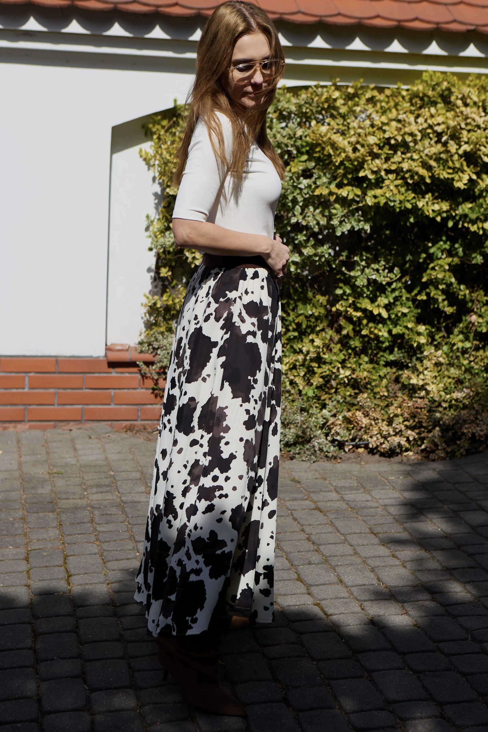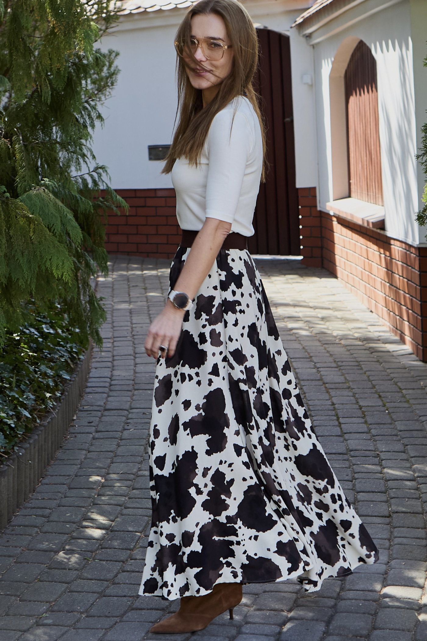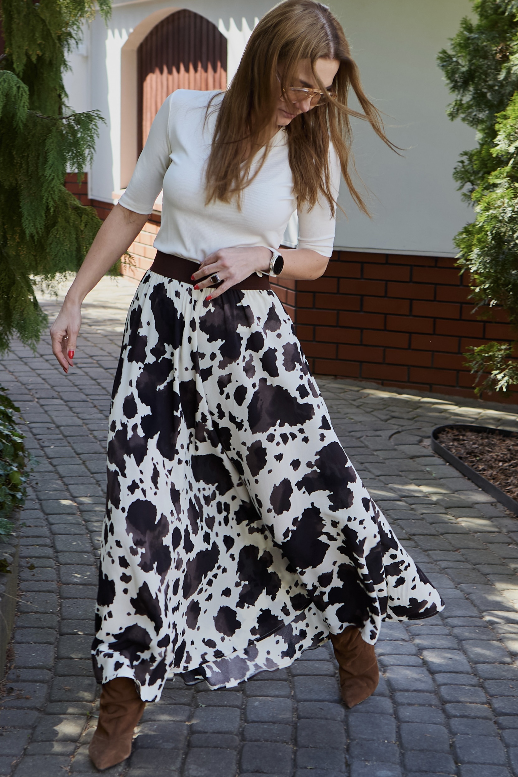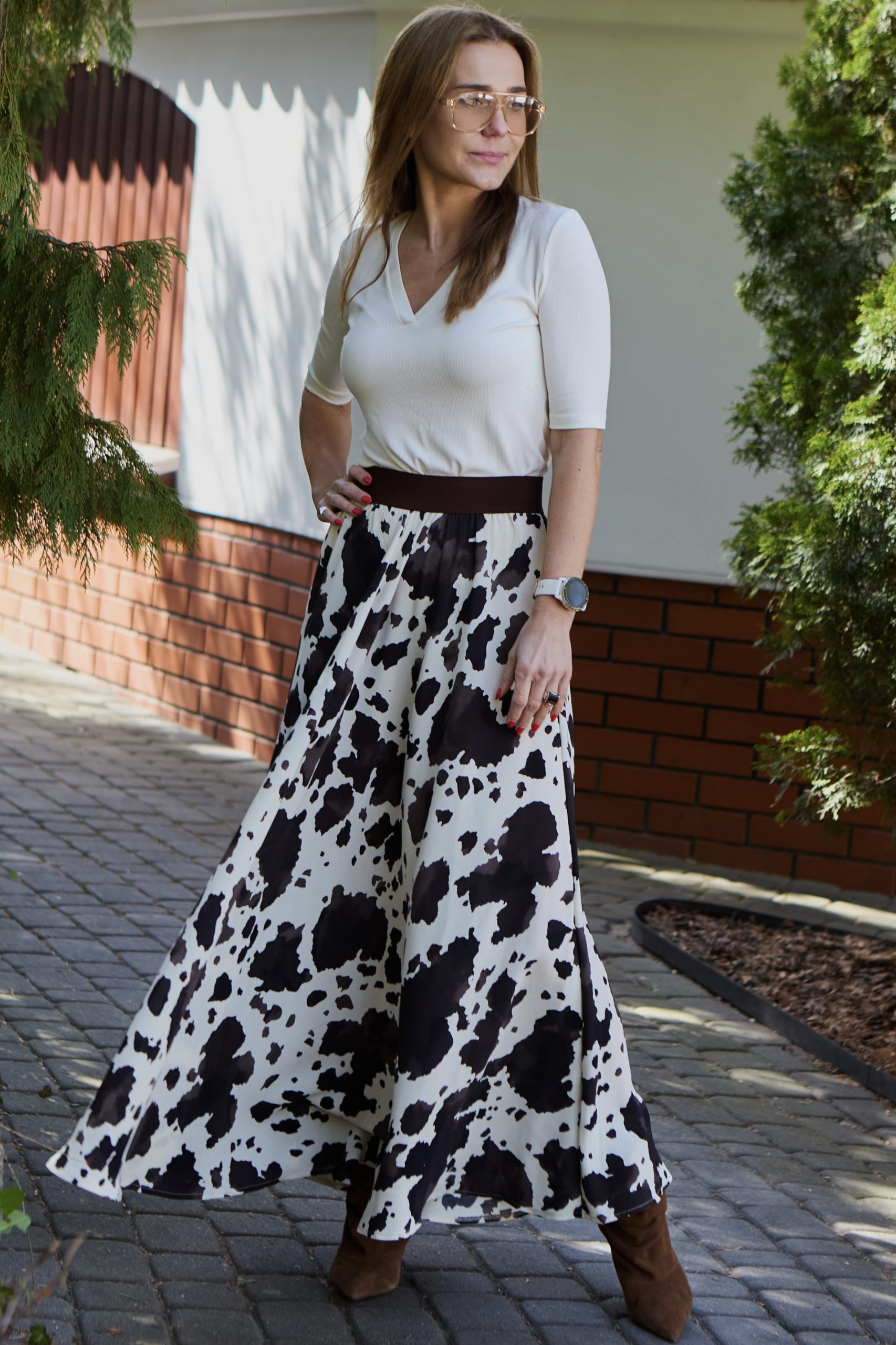 Lekka i wyjątkowo kobieca spódnica o długości maxi uszyta ze zwiewnej wiskozy w biało brązowy print. Fason rozszerzany ku dołowi, mocno marszczony. W talii guma, która umożliwia dopasowanie. Spódnica idealnie nadaje się zarówno na bardziej formalne okazje jak i na codzienne wyjścia. Idealna zarówno do eleganckiego jak i sportowego obuwia. Występuje w dwóch rozmiarach. Uszyta w Polsce, w kameralnej pracowni pod Warszawą.