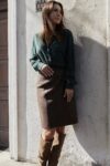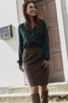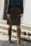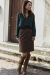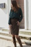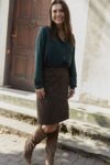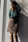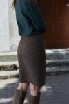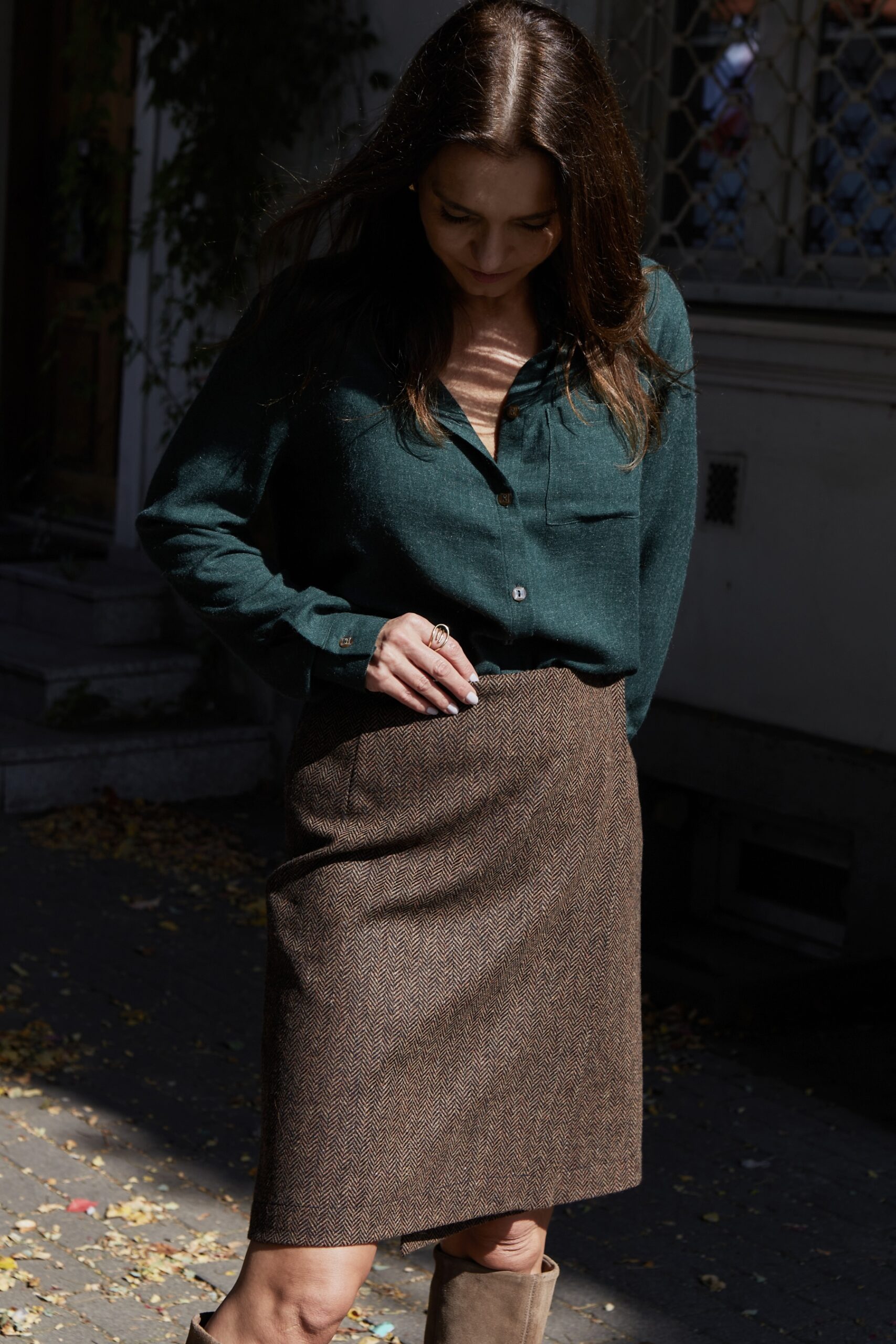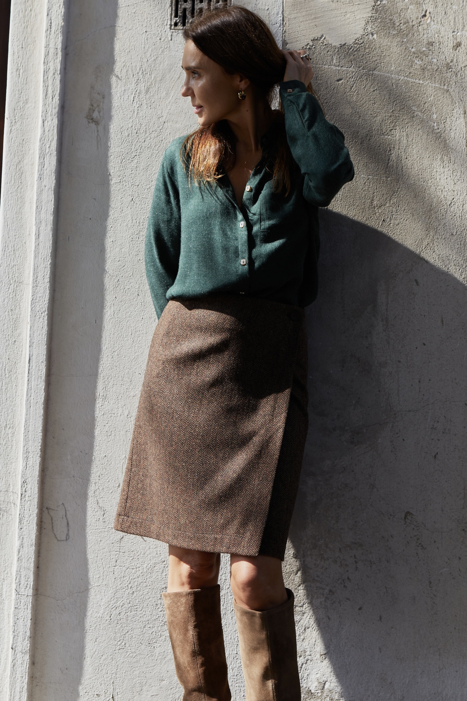 Prosta, kopertowa spódnica uszyta z wysokogatunkowej wełny w ciemno brązową jodełkę, na wiskozowej podszewce. Spódnica jest zapinana na guzik od zewnątrz i od spodu. Posiada po dwa guziki od spodu i dwa na zewnątrz, co pozwala na dodatkową regulację. Szerokość można regulować zapinając na wybrany guzik, w zależności od rozmiaru. Idealna na wiele okazji. Pasuje zarówno do sportowych butów jak i do eleganckich szpilek, kozaków. Made in Poland. Garmatura wełny: 190 g/m2.