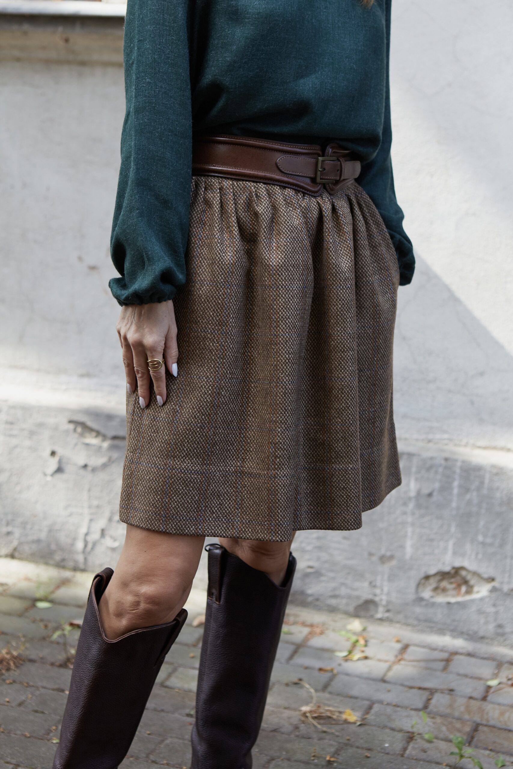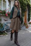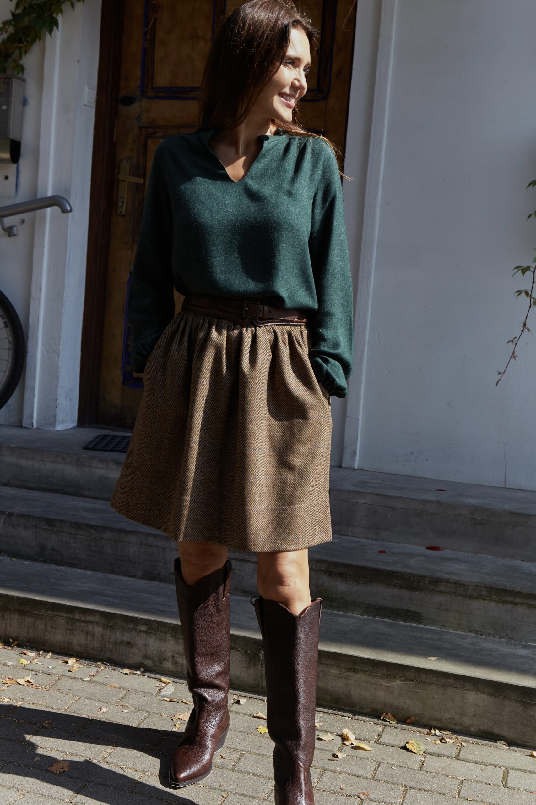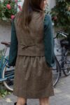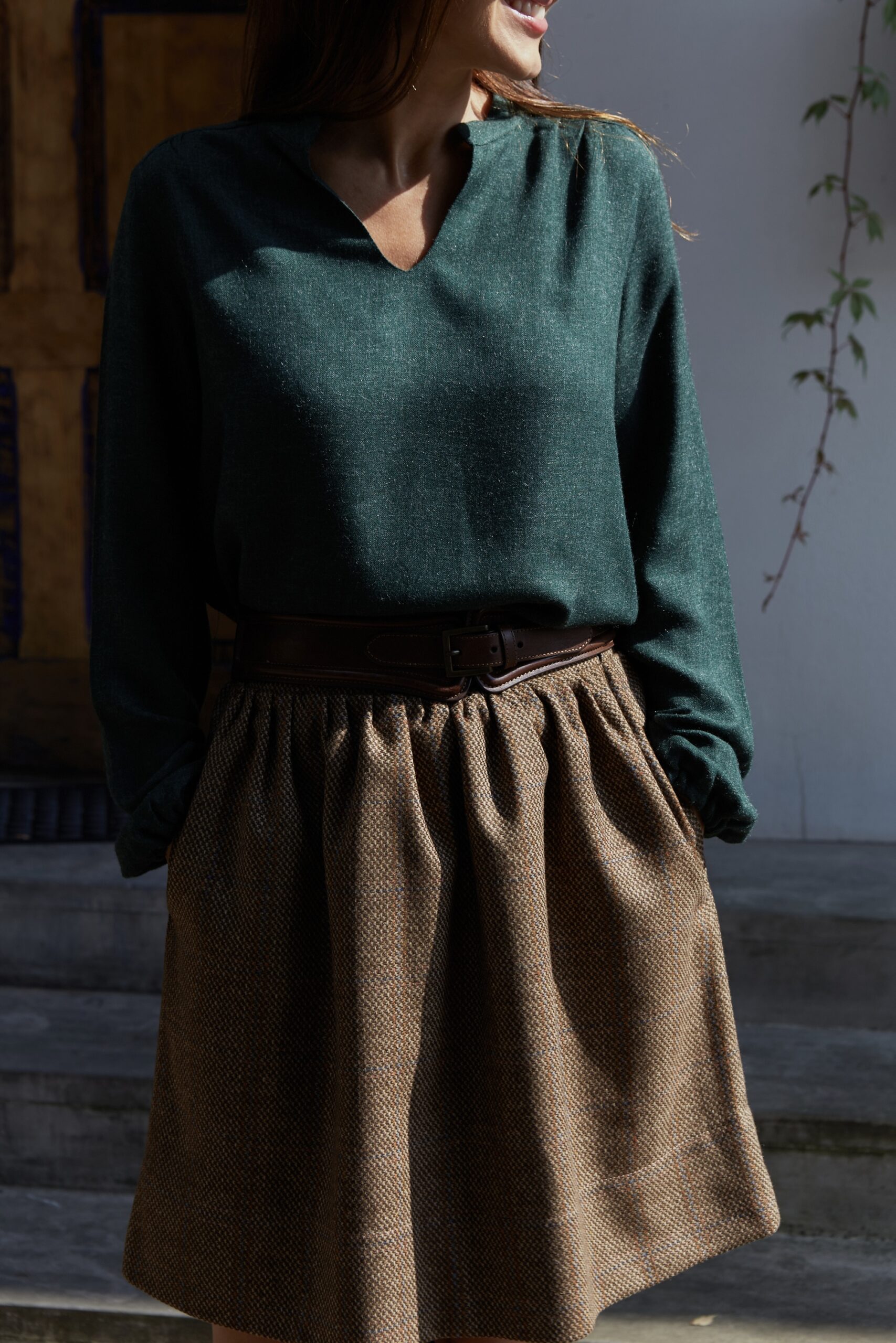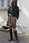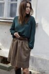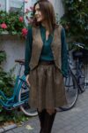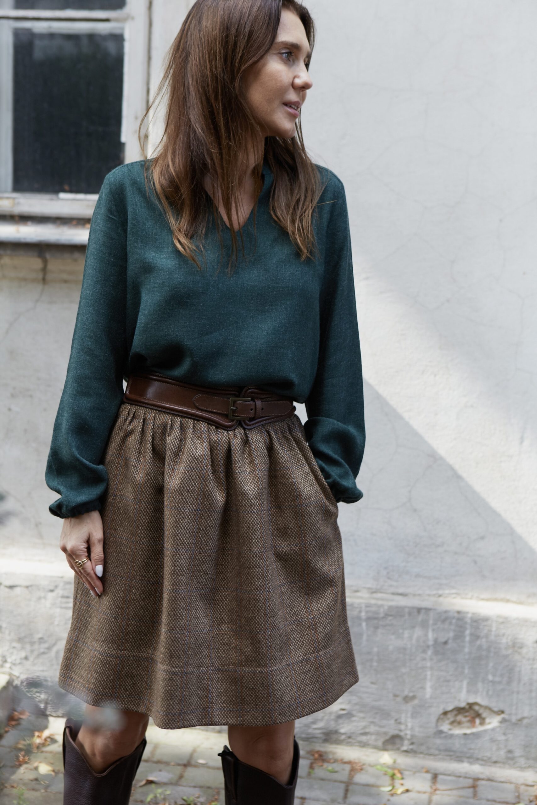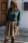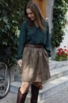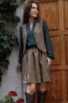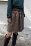 Marszczona, bardzo stylowa spódnica o długości “przed kolano”, posiada podszewkę, wykonana z wysokogatunkowej wełny w kolorze ciemno beżowym. Z tyłu w talii posiada gumę, która pozwala na idealne dopasowanie, z kieszeniami, jest ciepła dlatego idealne sprawdzi się na jesienno-zimową pogodę. Pasuje do wielu stylizacji, zarówno eleganckich jak i sportowych. Posiada szlufki, co umożliwia stylizowanie jej z dowolnym paskiem. Świetnie pasować będzie zarówno do wełnianego swetra jak i eleganckiej koszuli. Wyprodukowana w Polsce, posiada 100% wełny w składzie. Garmatura wełny: 280 g/m2.