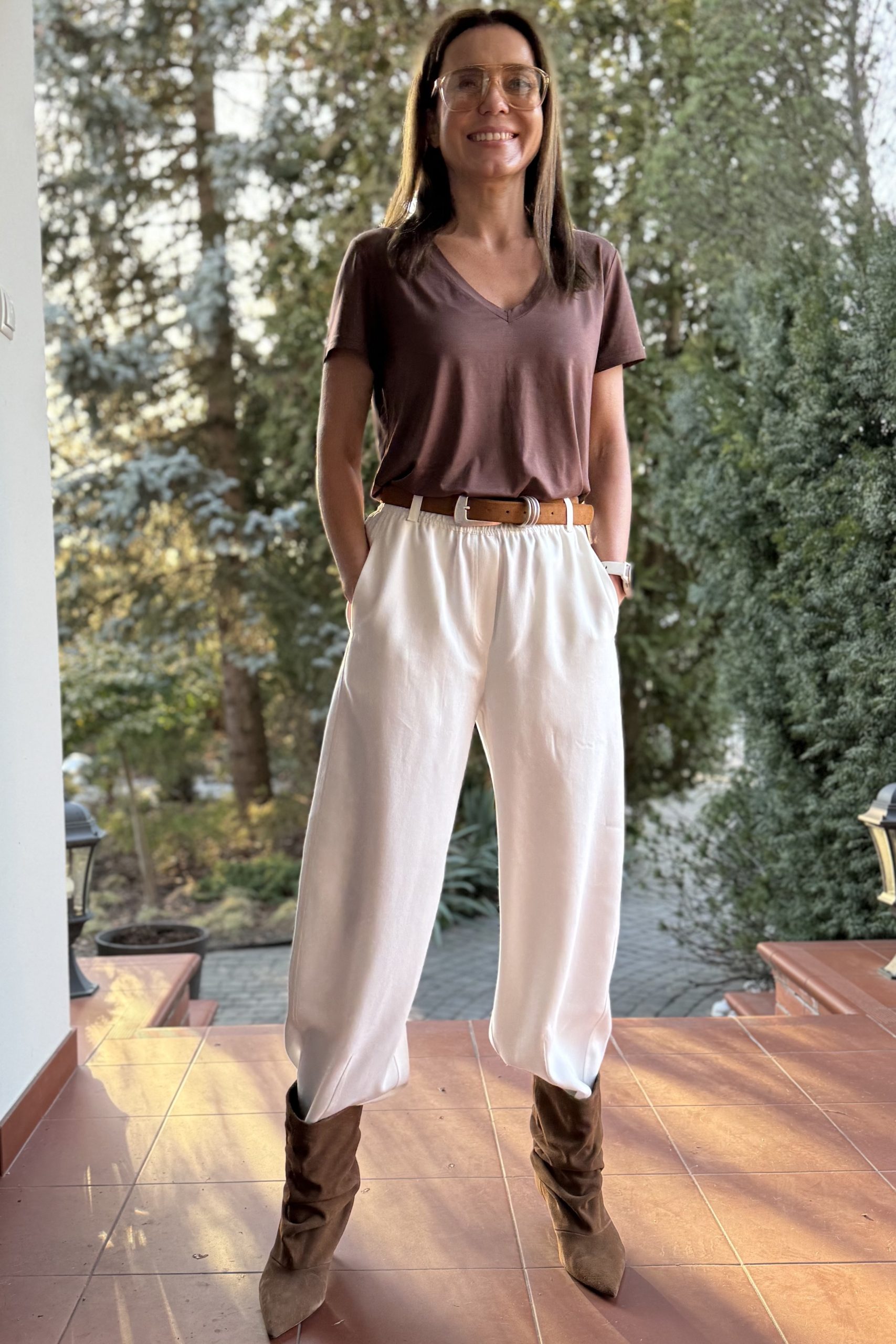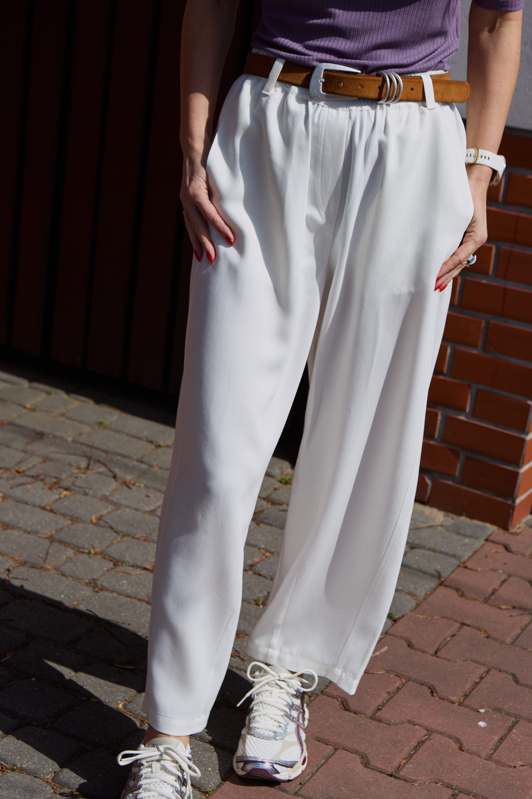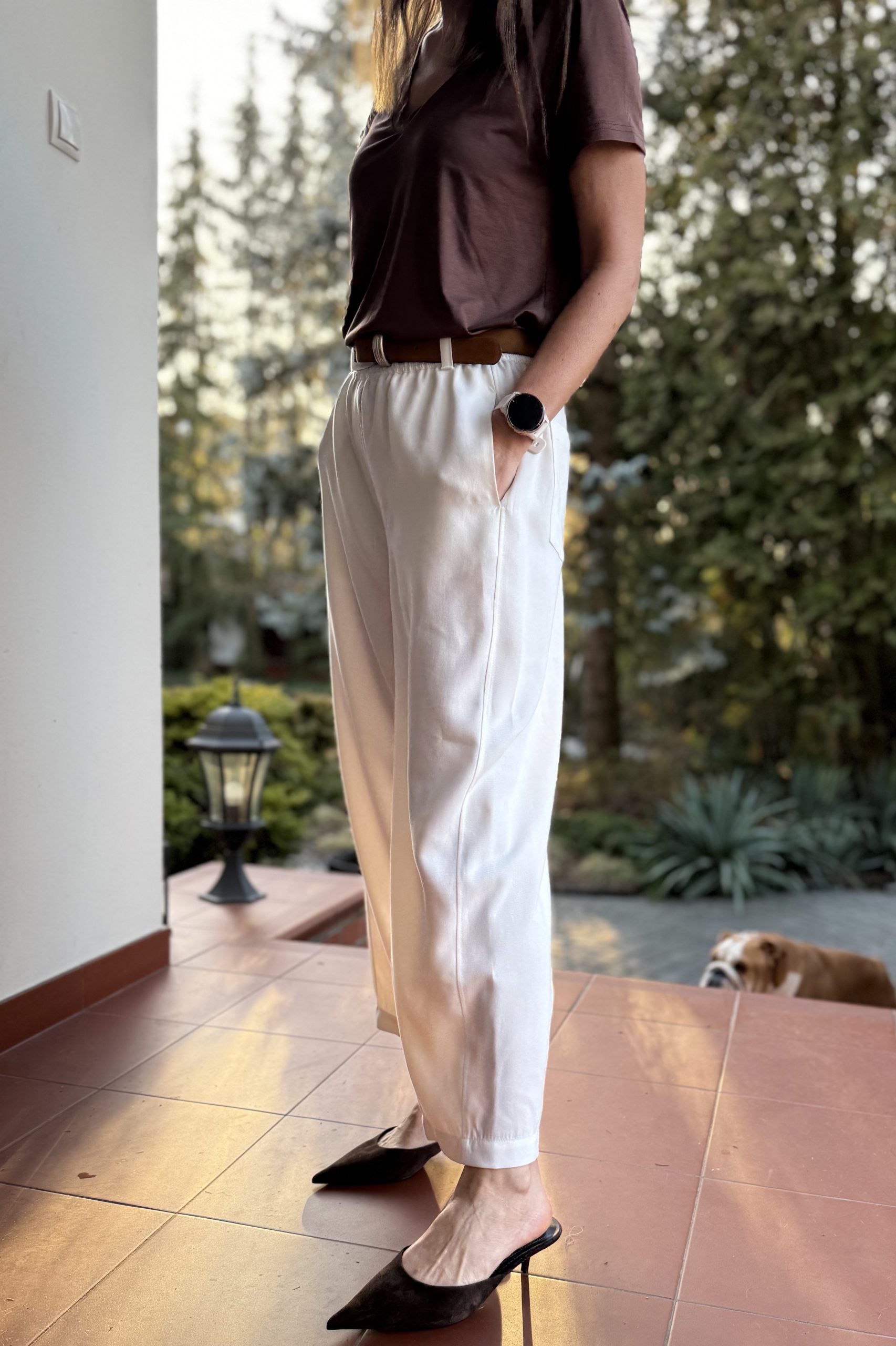 Szerokie, oversizeowe spodnie wykonane z wysokiej jakości materiału Tencel w kolorze ciepłej bieli, który jest lekki i bardzo układający się – idealny na wiosenno/letnią aurę. Fason typu BARREL to luźna nogawka lekko zwężana na dole o długości do kostki oraz lekko obniżony krok. Spodnie posiadają kieszenie z przodu oraz z tyłu. W pasie guma, stan regularny. Można je nosić z paskiem, ponieważ posiadają szlufki. Idealne na wiele okazji. Pasują zarówno do eleganckiej koszuli jak i sportowego topu. Idealne do botków, mokasynów oraz butów sportowych. Spodnie występują w dwóch rozmiarach. Uszyte w szwalni na warszawskiej Pradze.