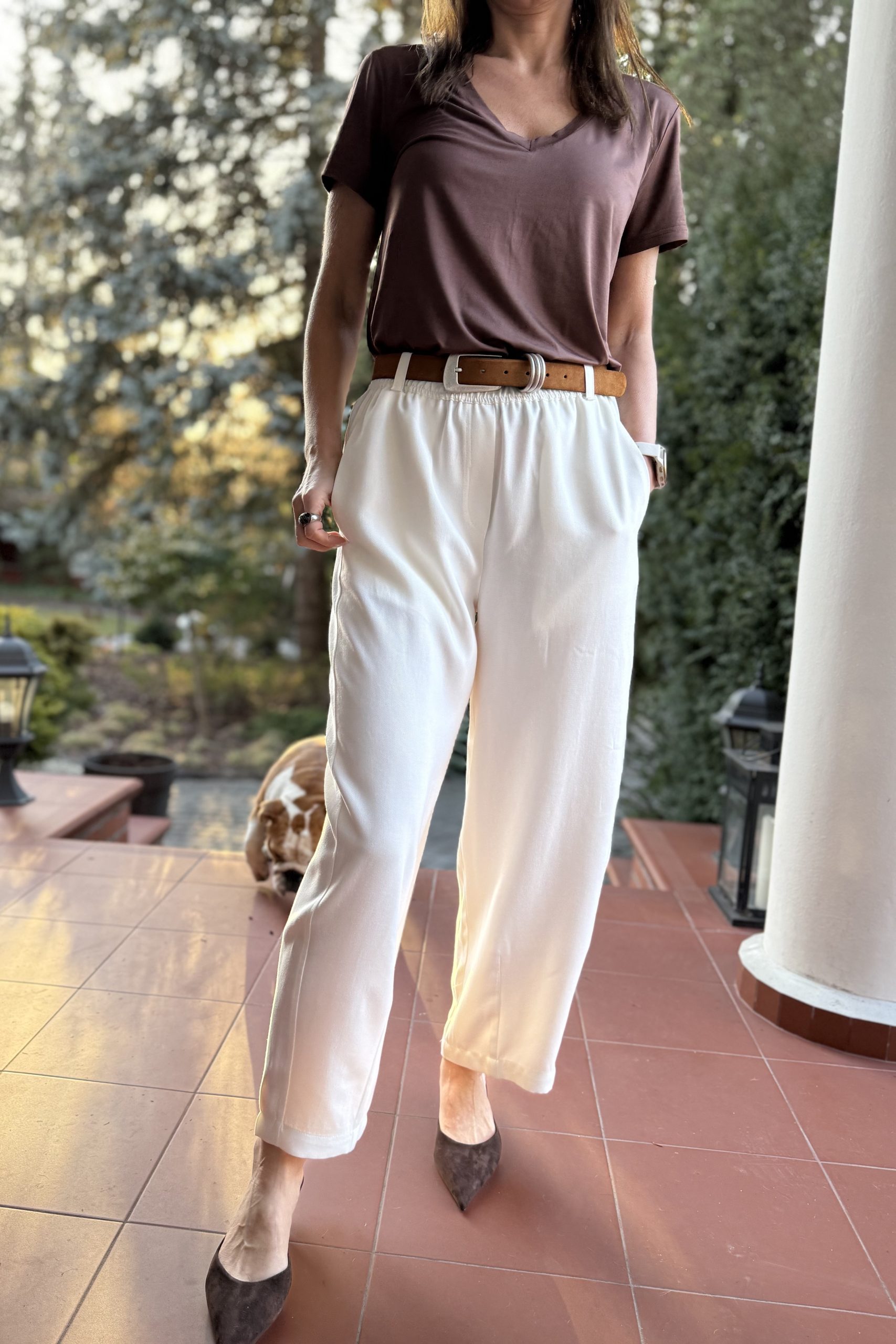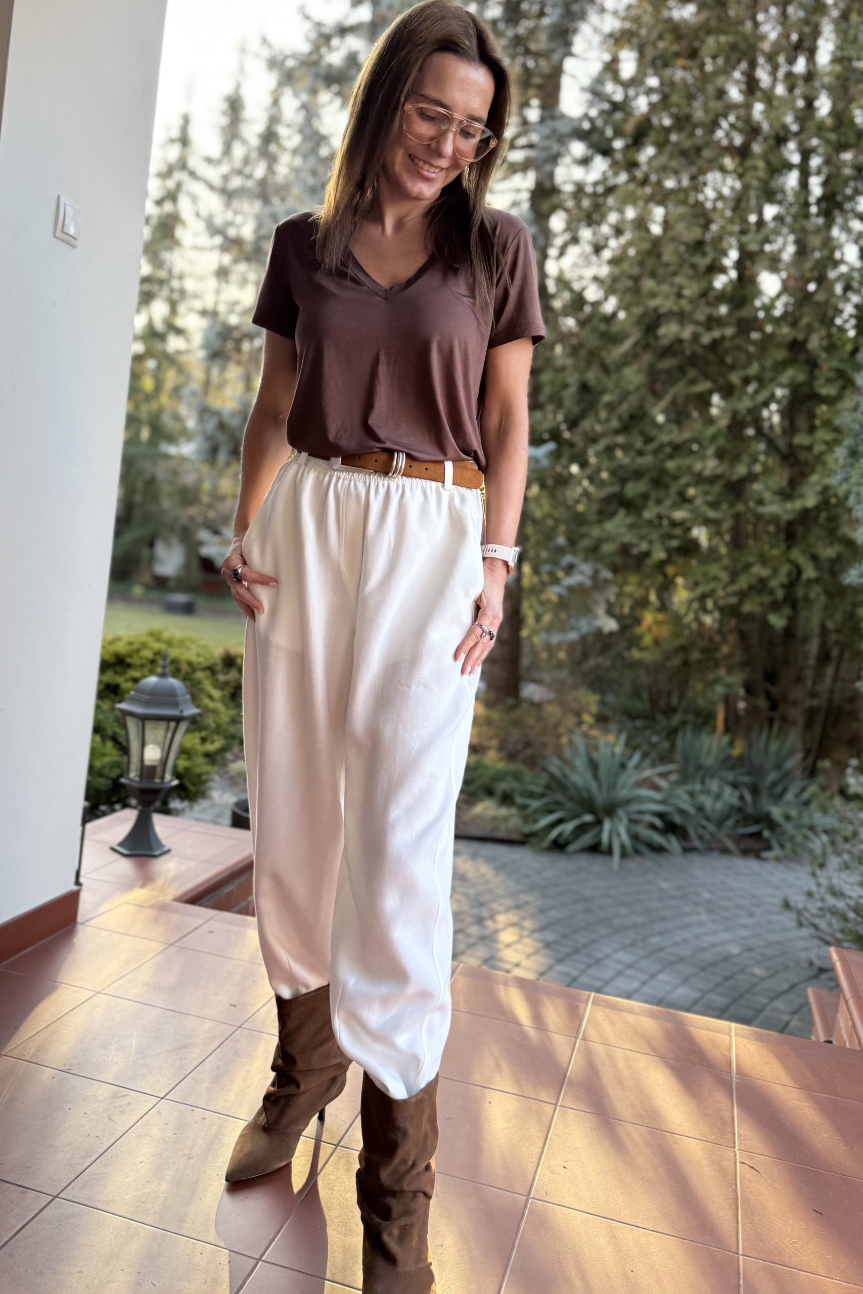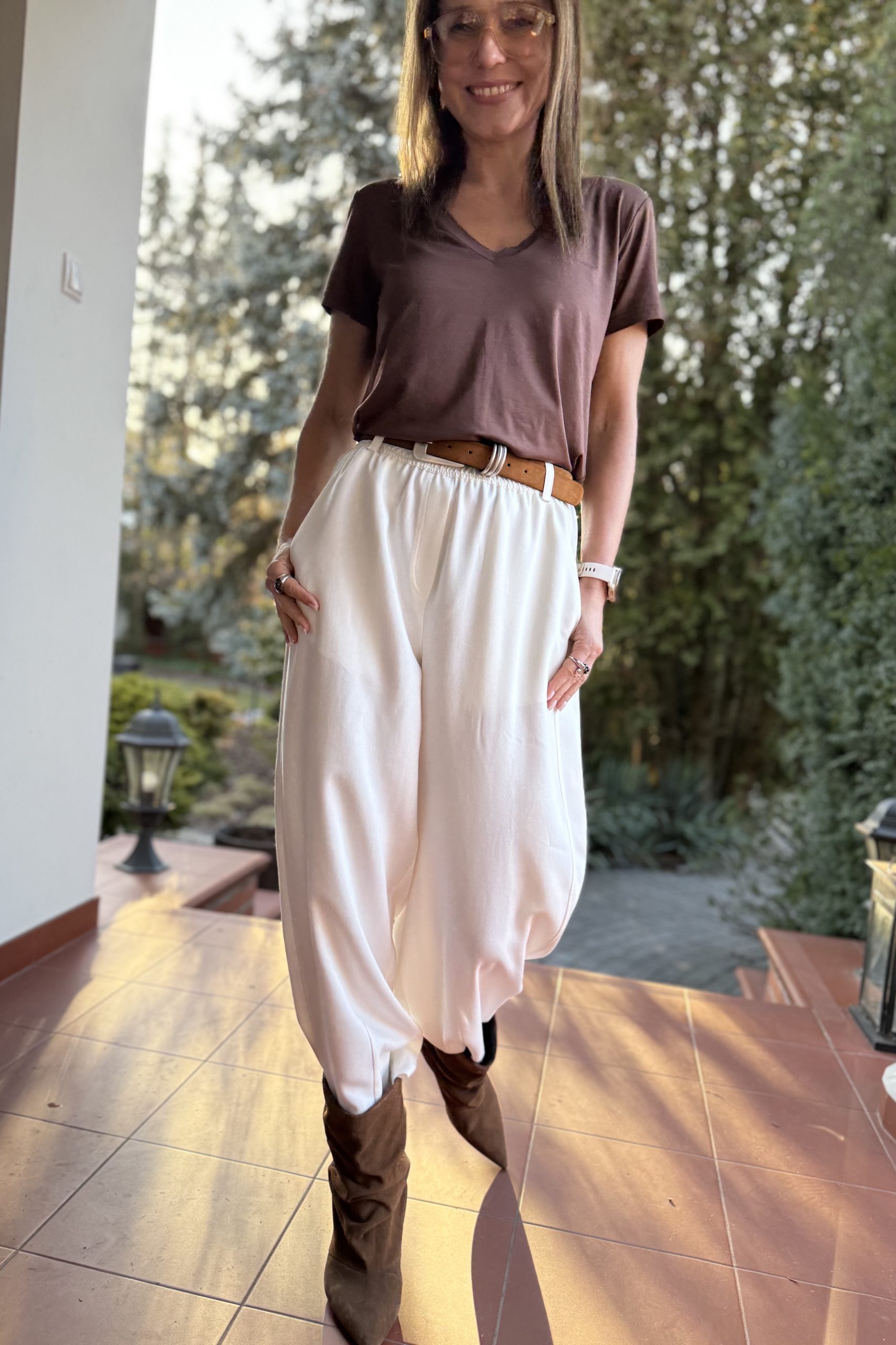 Szerokie, oversizeowe spodnie wykonane z wysokiej jakości materiału Tencel w kolorze ciepłej bieli, który jest lekki i bardzo układający się – idealny na wiosenno/letnią aurę. Fason typu BARREL to luźna nogawka lekko zwężana na dole o długości do kostki oraz lekko obniżony krok. Spodnie posiadają kieszenie z przodu oraz z tyłu. W pasie guma, stan regularny. Można je nosić z paskiem, ponieważ posiadają szlufki. Idealne na wiele okazji. Pasują zarówno do eleganckiej koszuli jak i sportowego topu. Idealne do botków, mokasynów oraz butów sportowych. Spodnie występują w dwóch rozmiarach. Uszyte w szwalni na warszawskiej Pradze.