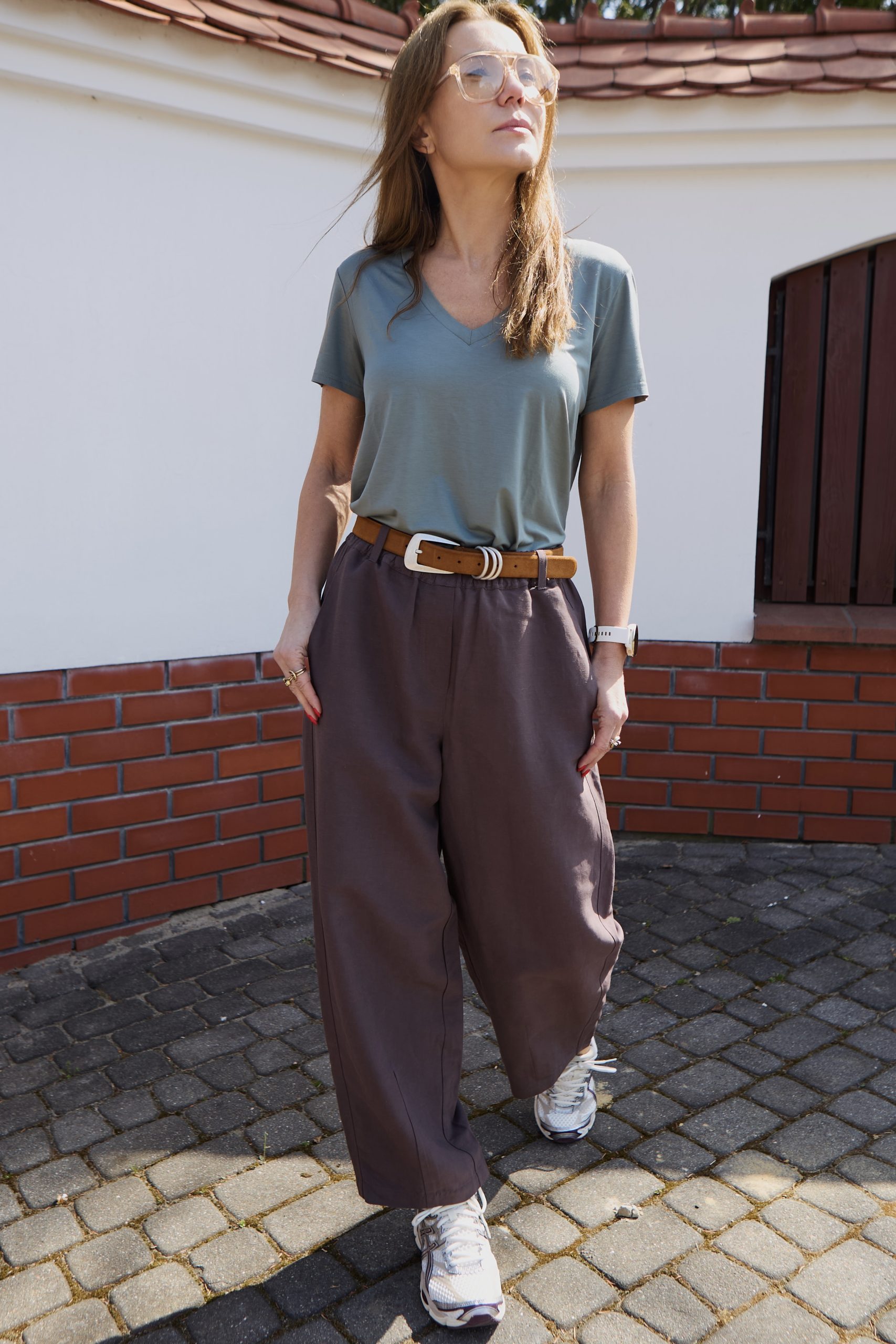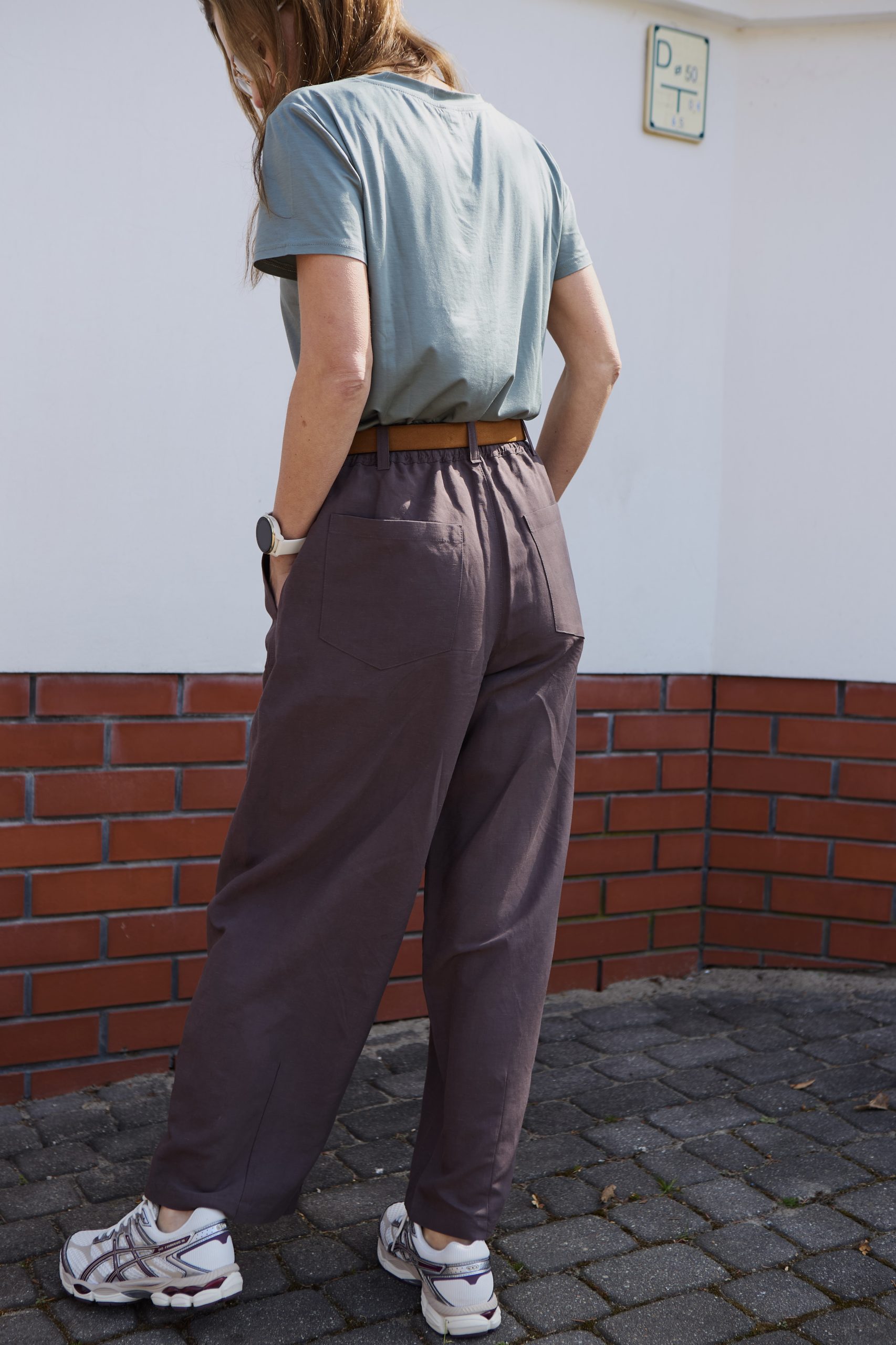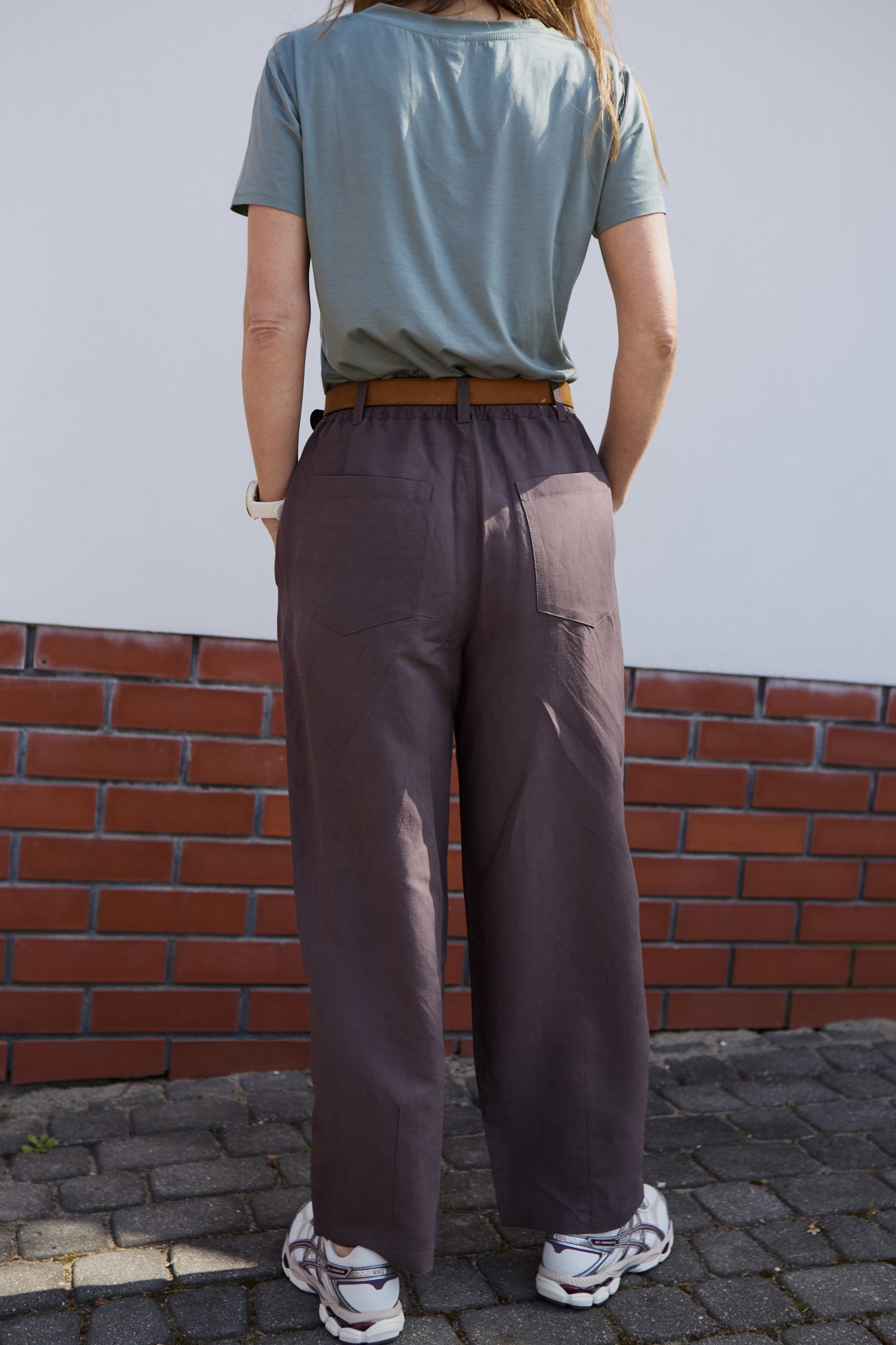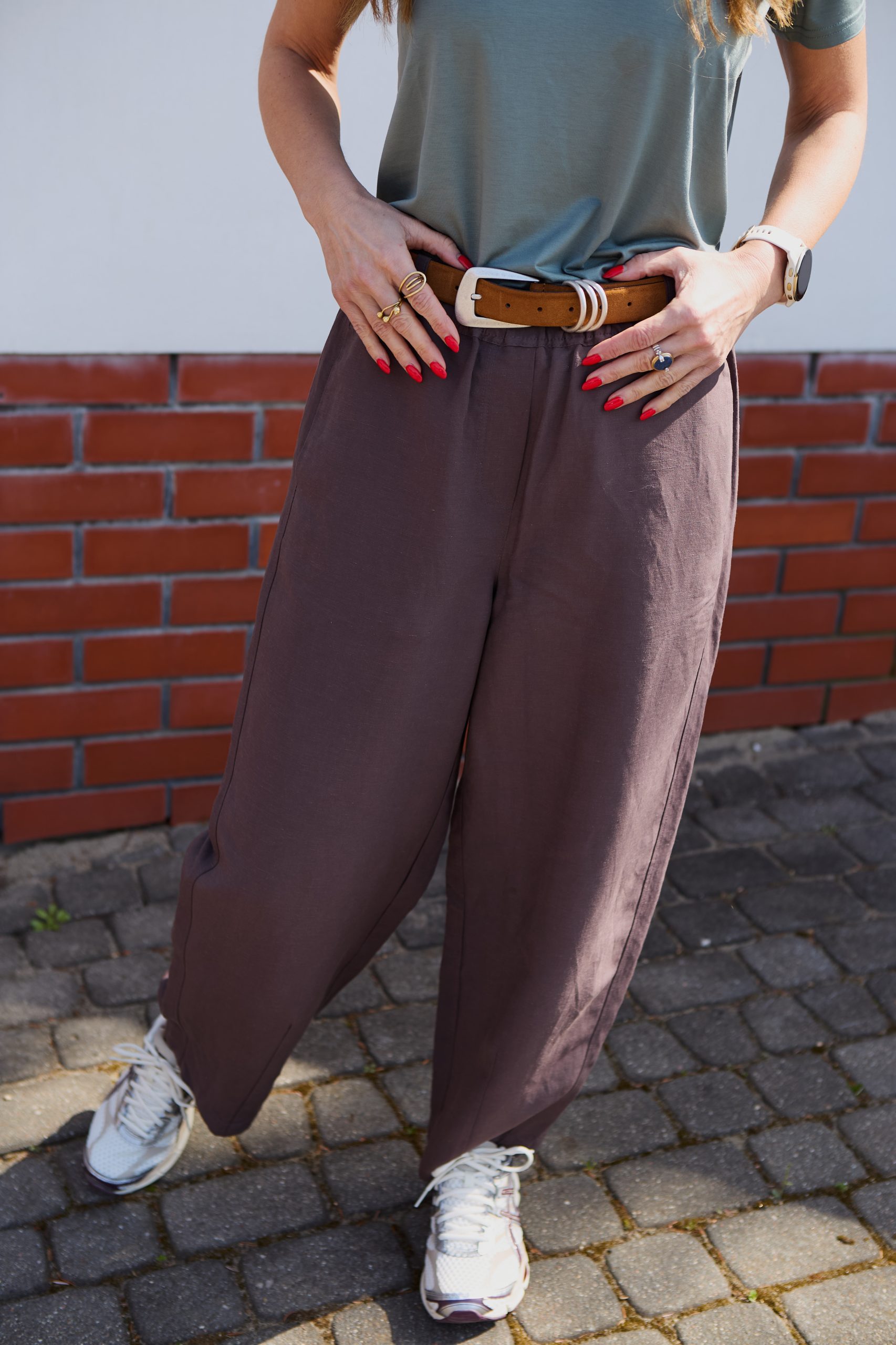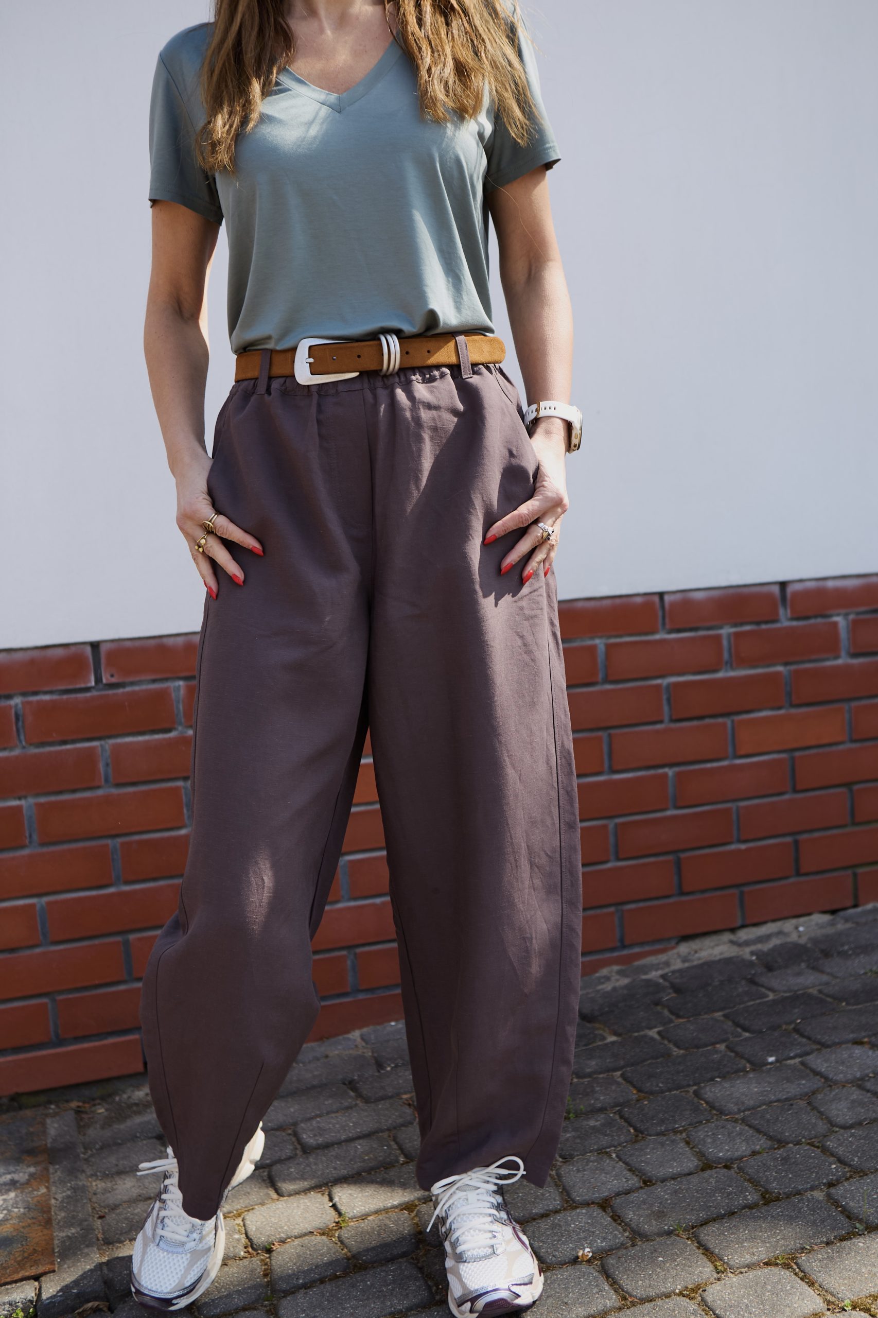 Szerokie, oversizeowe spodnie wykonane z wysokiej jakości mieszanki wiskozy i lnu w kolorze mlecznej czekolady – idealne na wiosenno/letnią aurę. Fason typu BARREL to luźna nogawka lekko zwężana na dole o długości do kostki oraz lekko obniżony krok. Spodnie posiadają kieszenie z przodu oraz z tyłu. W pasie guma, stan regularny. Można je nosić z paskiem, ponieważ posiadają szlufki. Idealne na wiele okazji. Pasują zarówno do eleganckiej koszuli jak i sportowego topu. Idealne do botków, mokasynów oraz butów sportowych. Spodnie występują w dwóch rozmiarach. Uszyte w szwalni na warszawskiej Pradze.