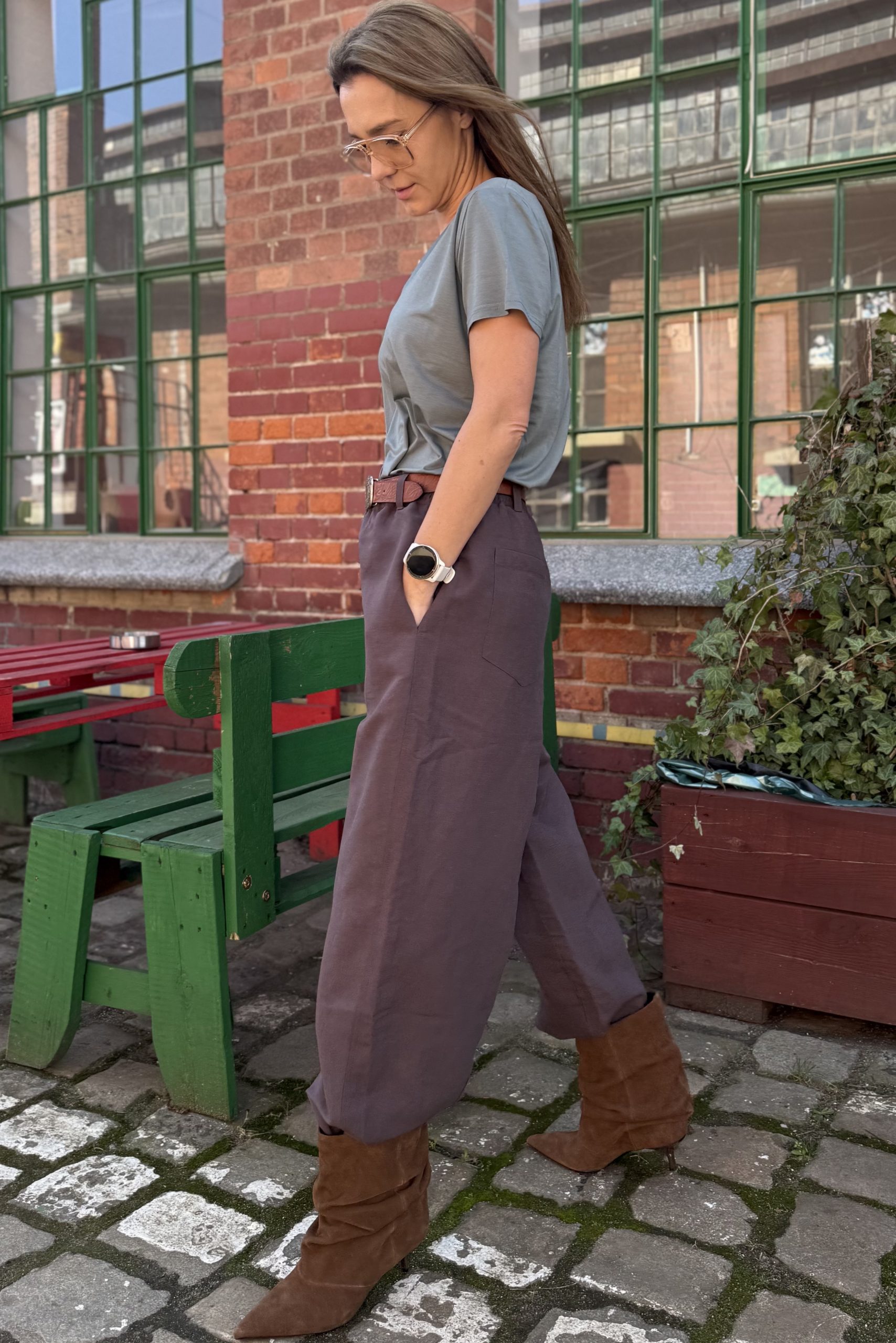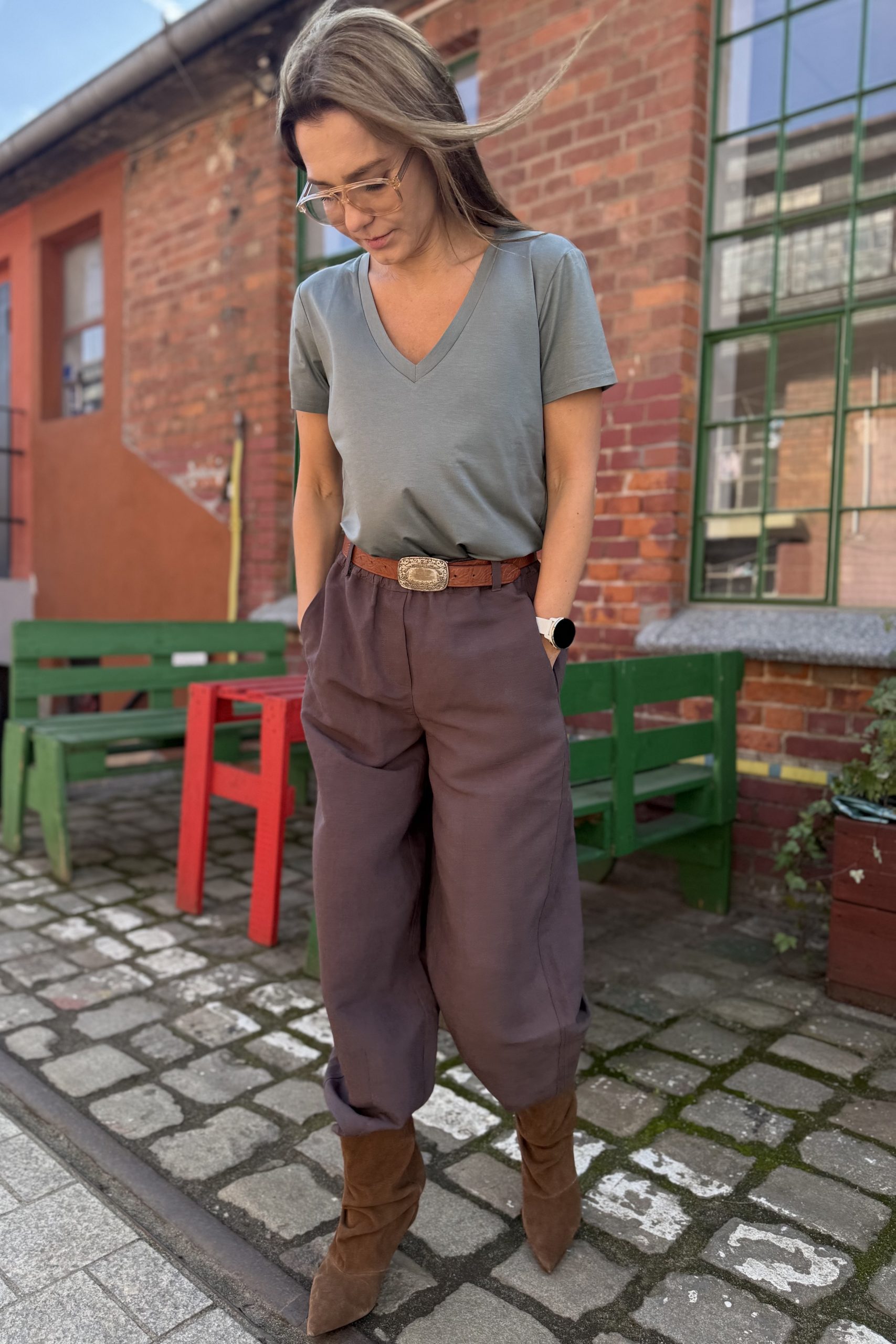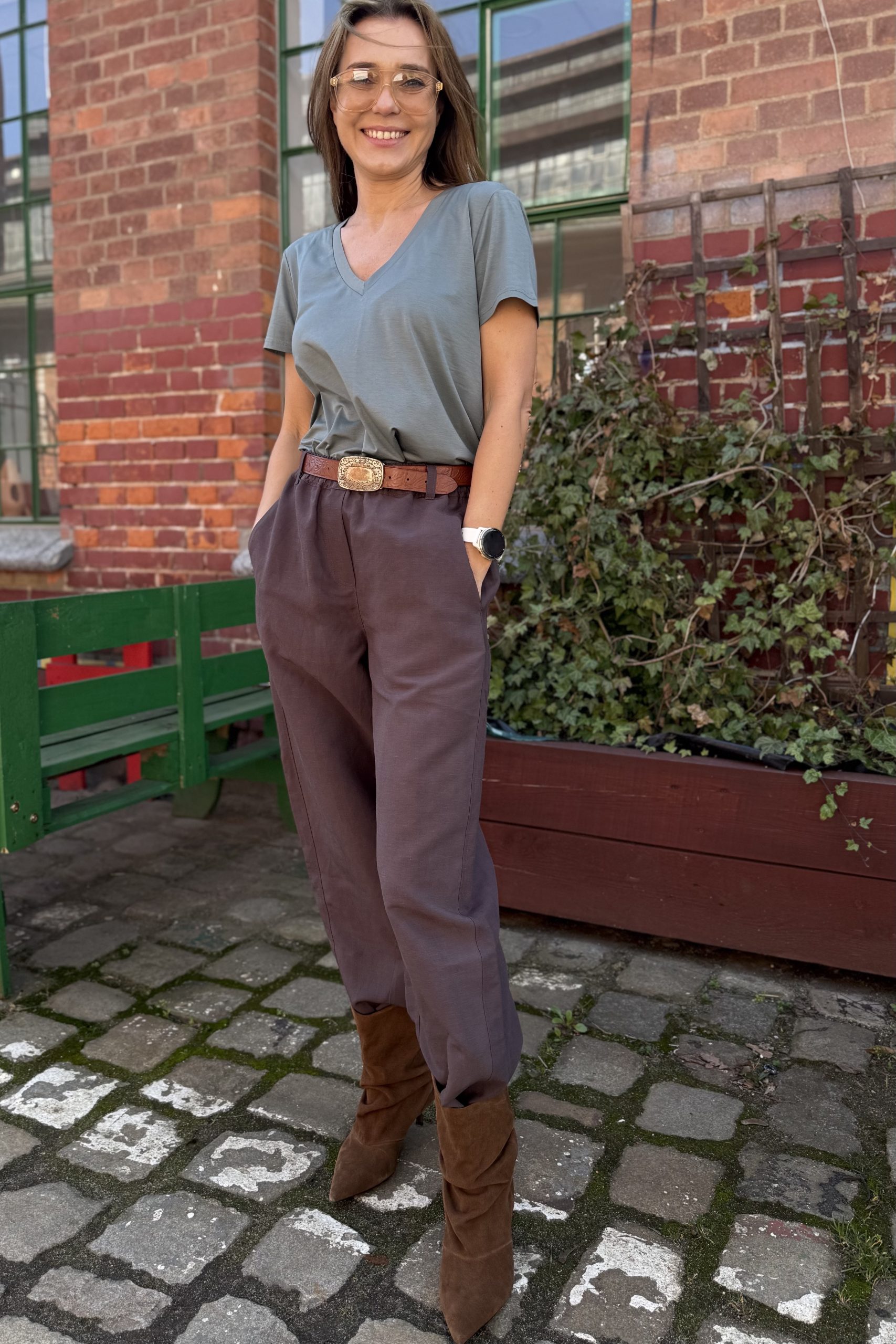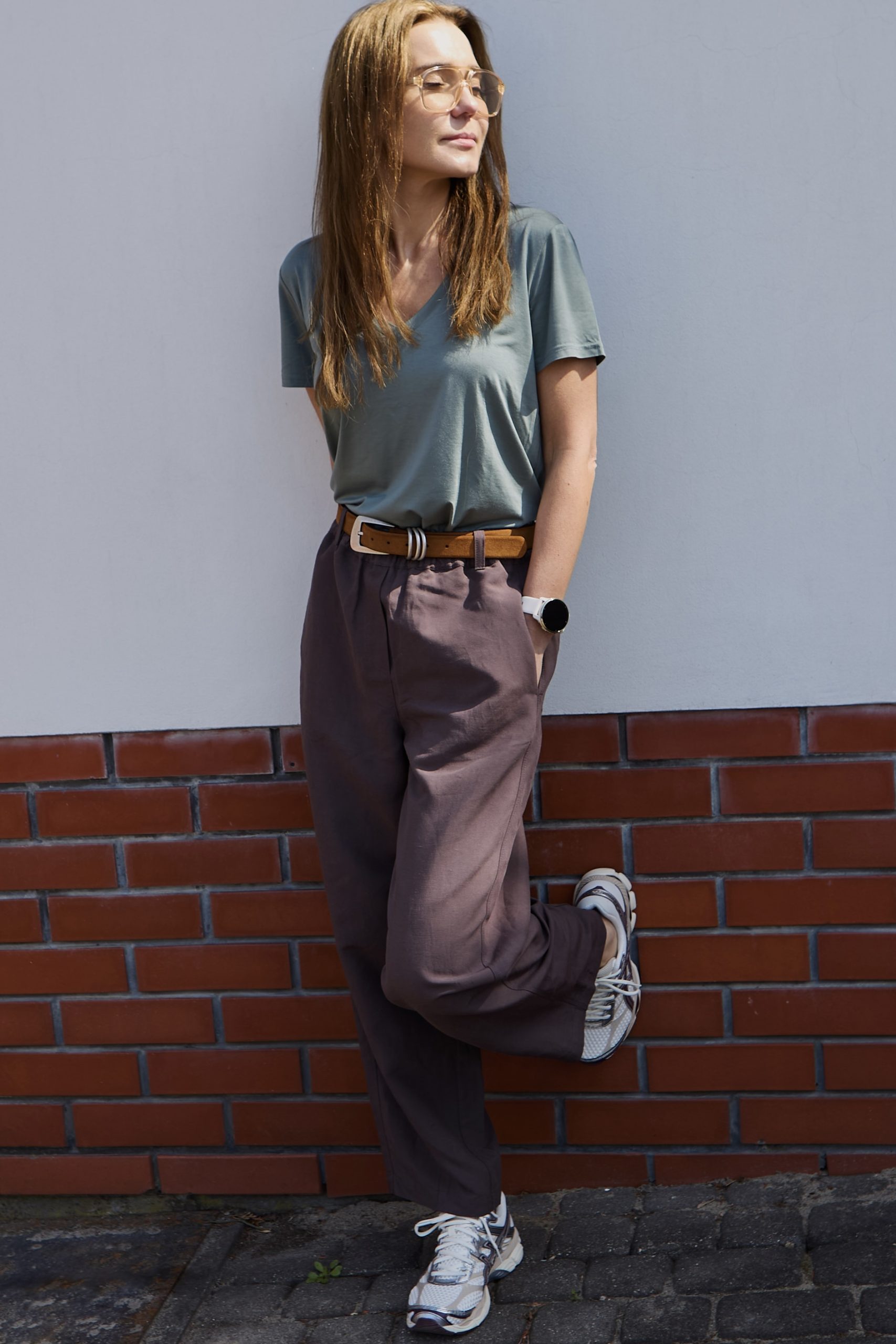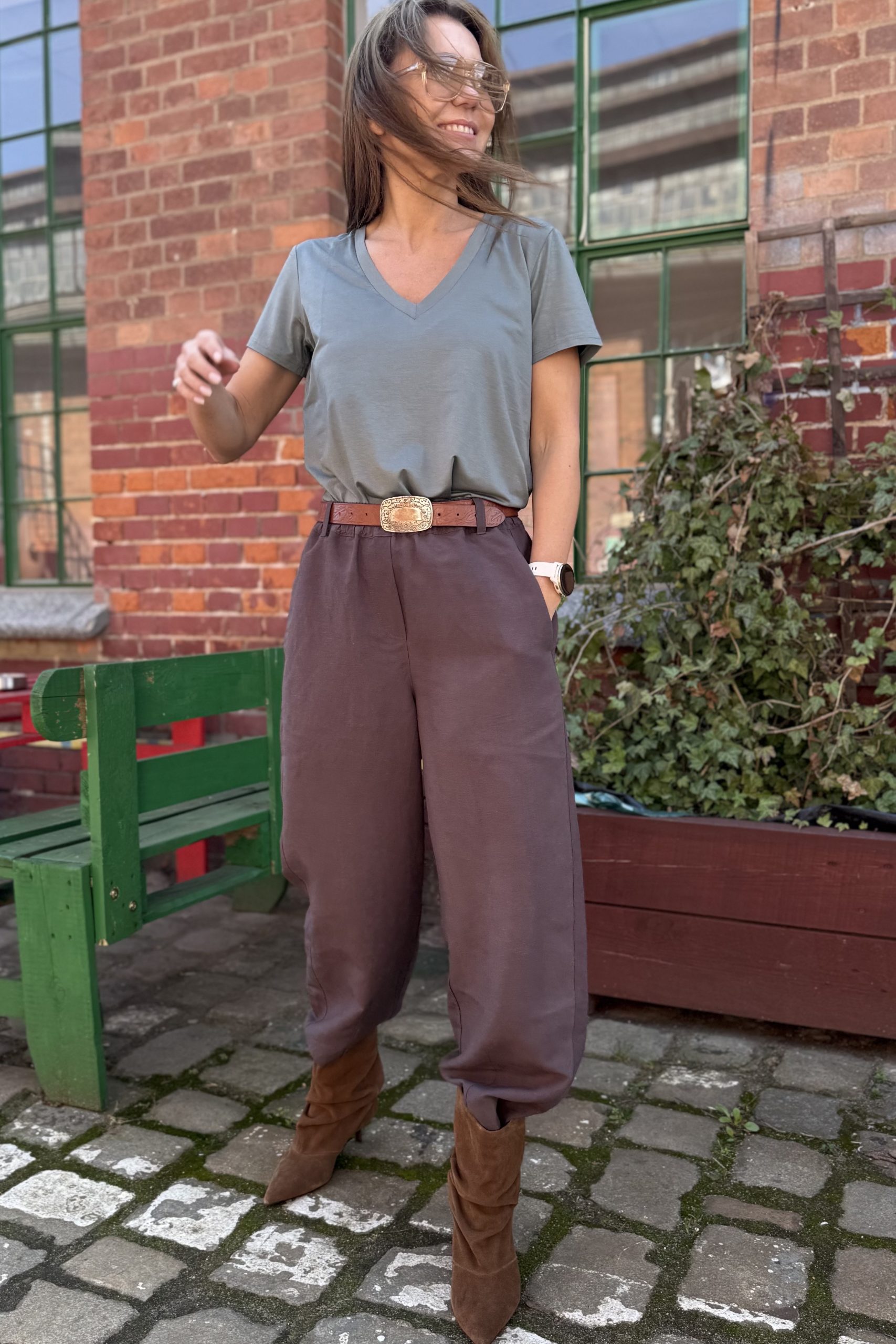 Szerokie, oversizeowe spodnie wykonane z wysokiej jakości mieszanki wiskozy i lnu w kolorze mlecznej czekolady – idealne na wiosenno/letnią aurę. Fason typu BARREL to luźna nogawka lekko zwężana na dole o długości do kostki oraz lekko obniżony krok. Spodnie posiadają kieszenie z przodu oraz z tyłu. W pasie guma, stan regularny. Można je nosić z paskiem, ponieważ posiadają szlufki. Idealne na wiele okazji. Pasują zarówno do eleganckiej koszuli jak i sportowego topu. Idealne do botków, mokasynów oraz butów sportowych. Spodnie występują w dwóch rozmiarach. Uszyte w szwalni na warszawskiej Pradze.