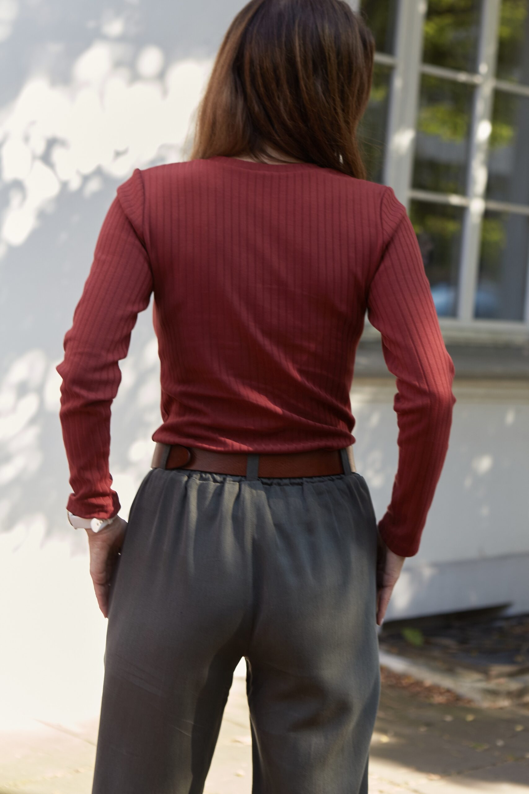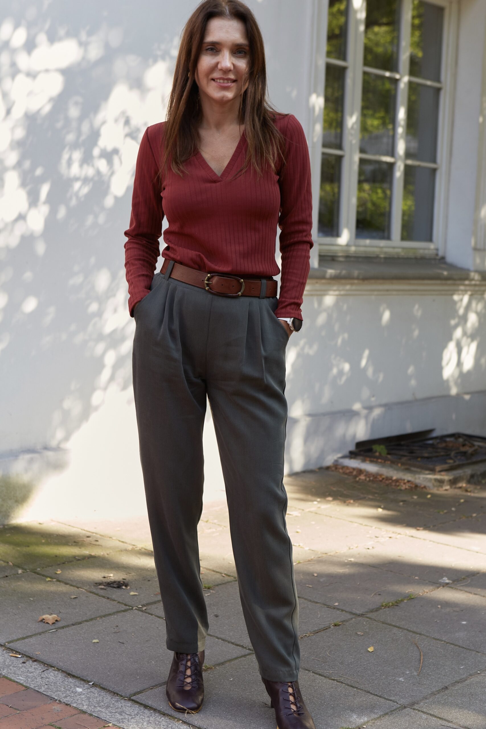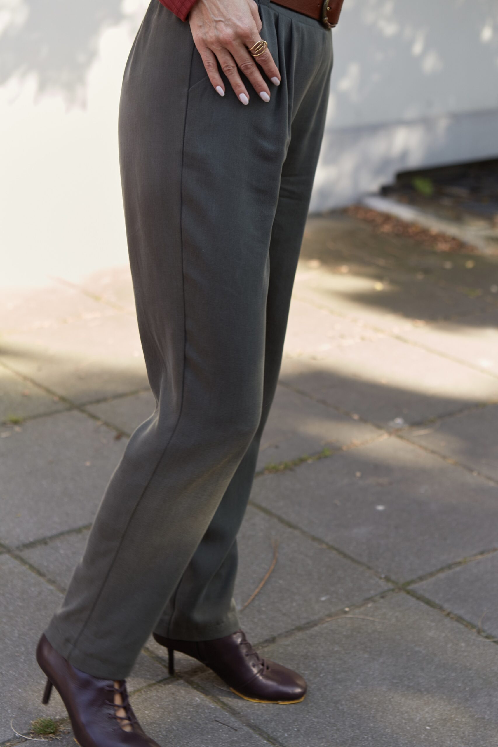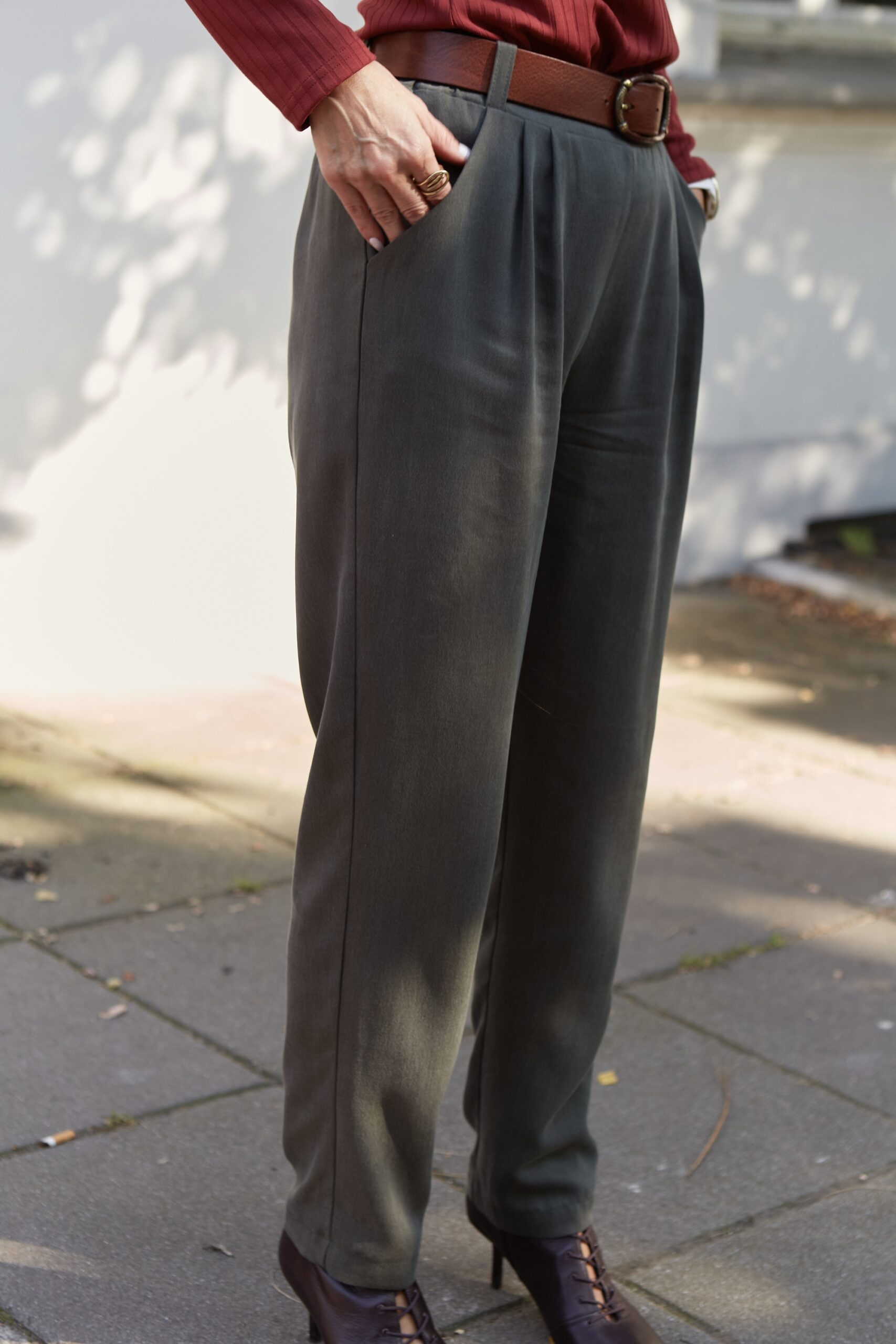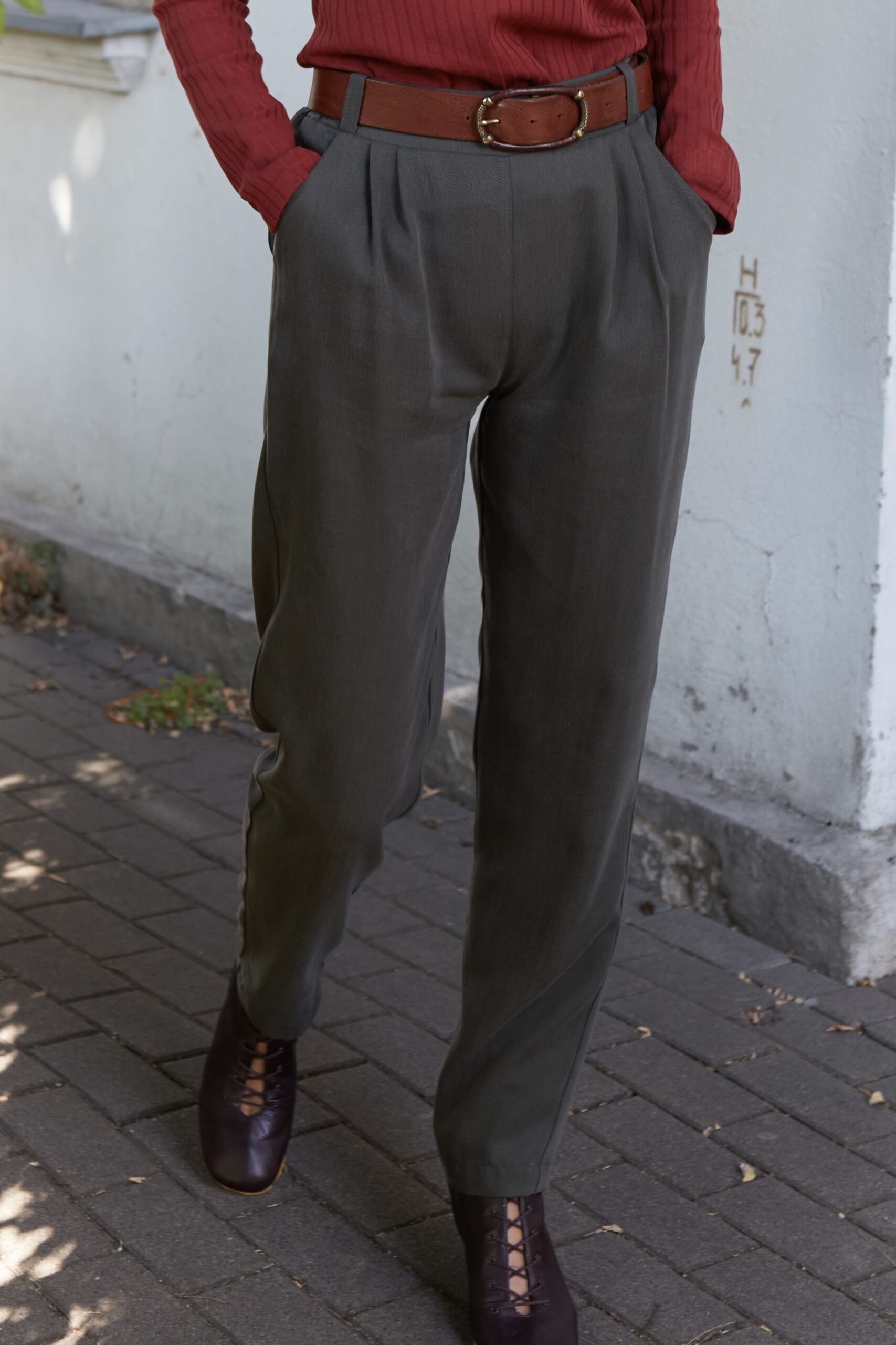 Szerokie, oversizeowe spodnie wykonane z tencela w kolorze khaki. Fason luźny, nogawka delikatnie zwężana, w pasie z tyłu guma, z przodu dwie zaszewki. Posiadają kieszenie. Spodnie można nosić wysoko w stanie lub z obniżonym stanem. Idealnie prezentują się ze skórzanym paskiem. Na wiele okazji. Pasują zarówno do eleganckiej koszuli jak i sportowego topu. Można je nosić podwinięte u dołu lub luźno puszczone. Idealne do botków, mokasynów oraz butów sportowych. Spodnie występują w dwóch rozmiarach.