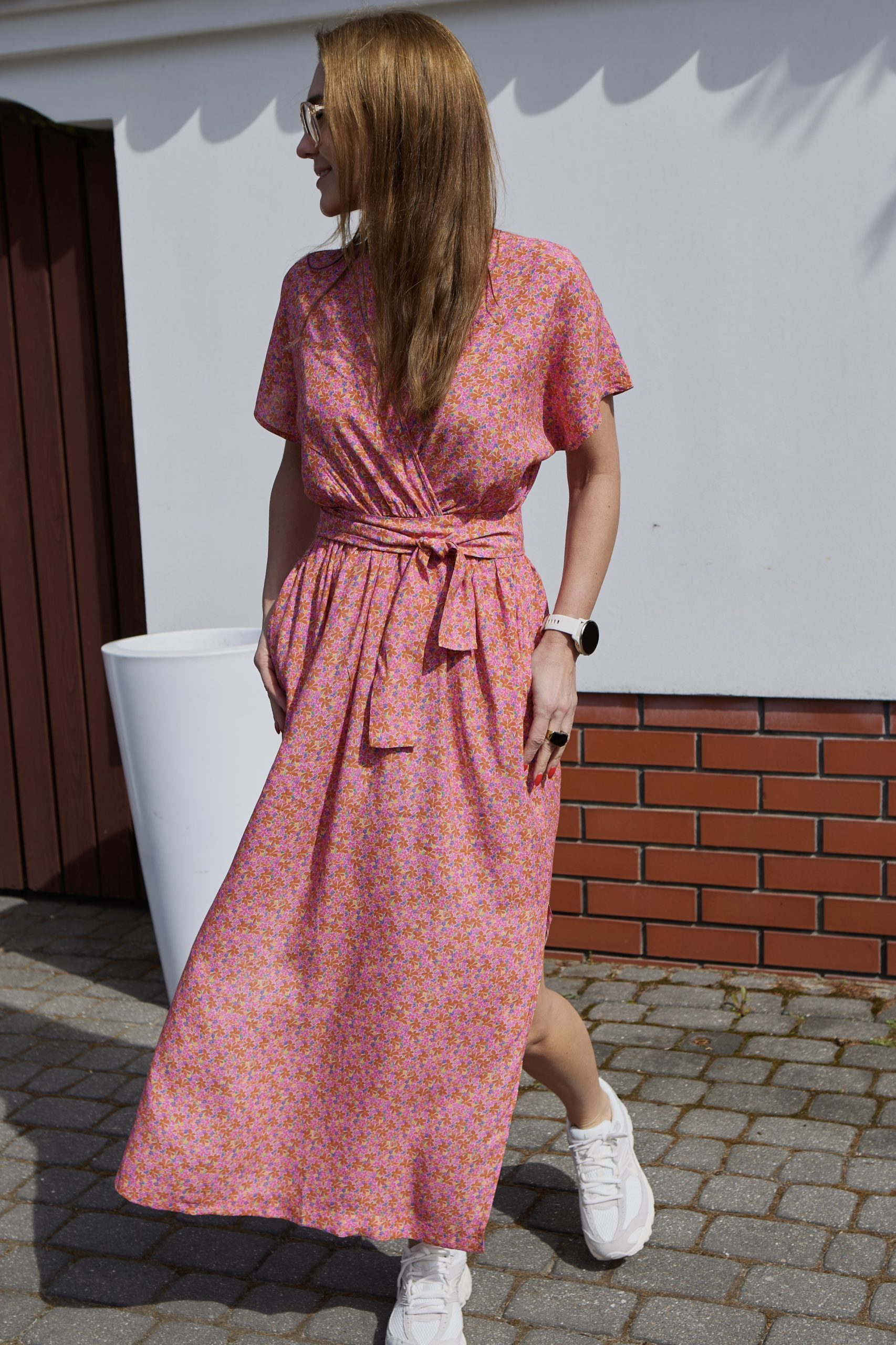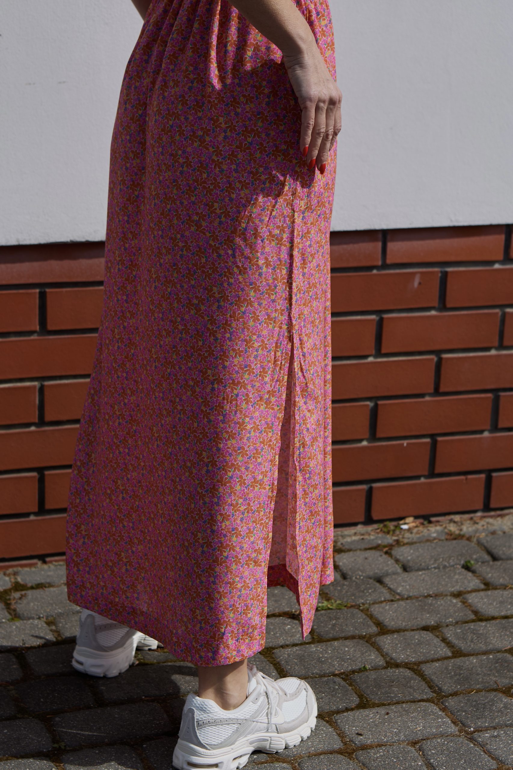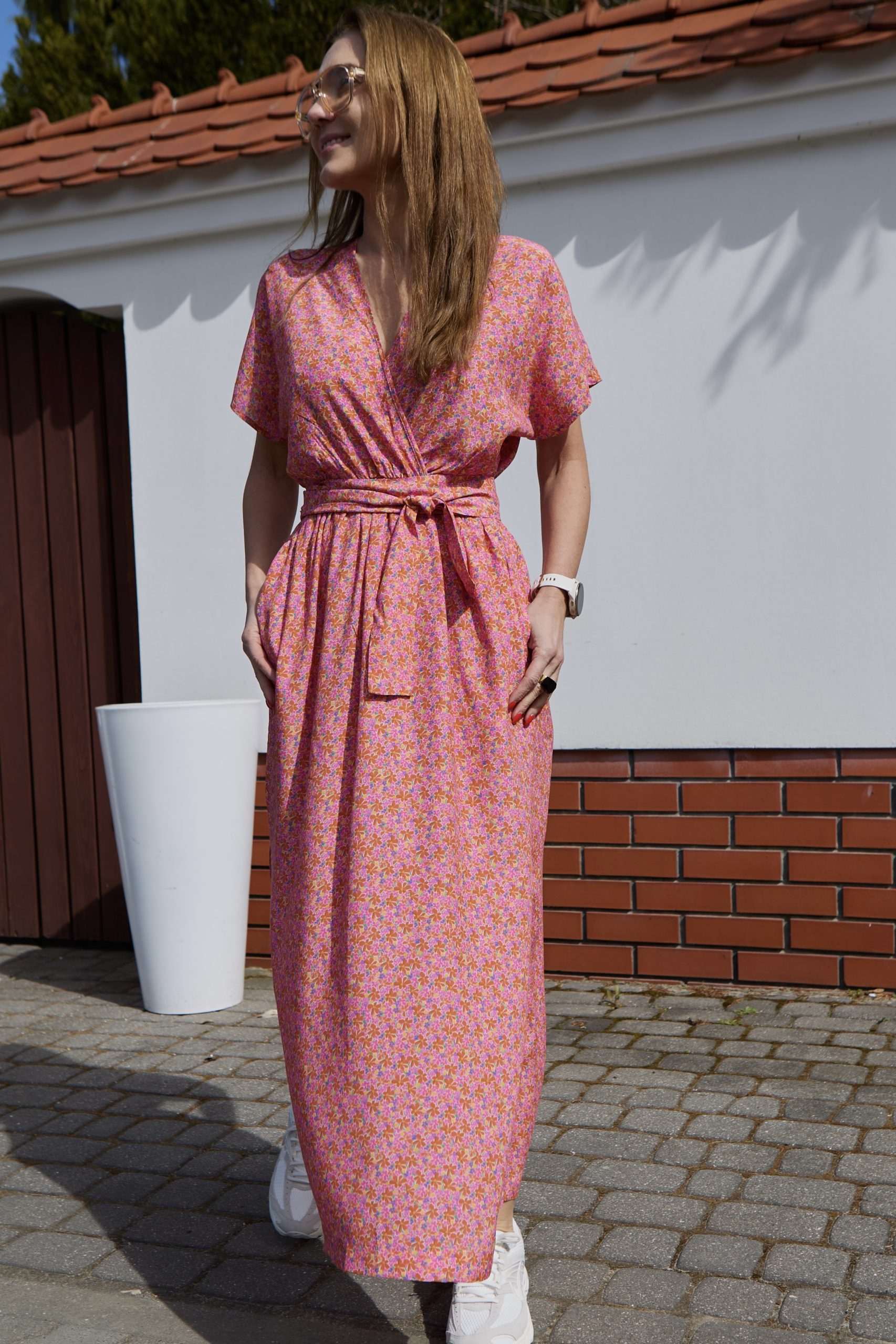 Sandi to wyjątkowo kobieca sukienka o długości do kostek, wykonana ze zwiewnej, szlachetnej wiskozy. Sukienka jest marszczona w talii (posiada gumę), do tego można przewiązać ją paskiem, który jest w komplecie. Można wykorzystać również inny dowolny pasek (np. pasek skórzany), który doda stylizacji bardziej formalny charakter. Sandi posiada kieszenie oraz dwa rozporki po bokach, które dodają sukience lekkości. Dekolt jest idealnie skrojony, przez co nie rozchodzi się na biuście. Rękaw jest krótki i kimonowy, co dodaje sukience jeszcze bardziej lekkiego charakteru. Do Sandi pasuje praktycznie każde obuwie – zarówno eleganckie szpilki jak i sportowe sneakersy lub casualowe espadryle, klapki. Sukienka występuje w dwóch rozmiarach: XS/S i M/L. Została uszyta w Polsce, w kameralnej pracowni na warszawskiej Pradze.