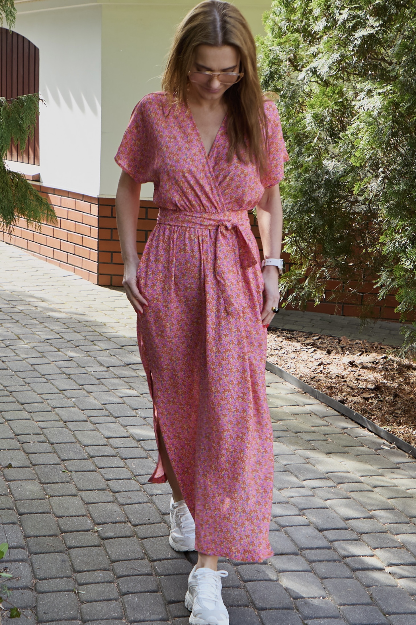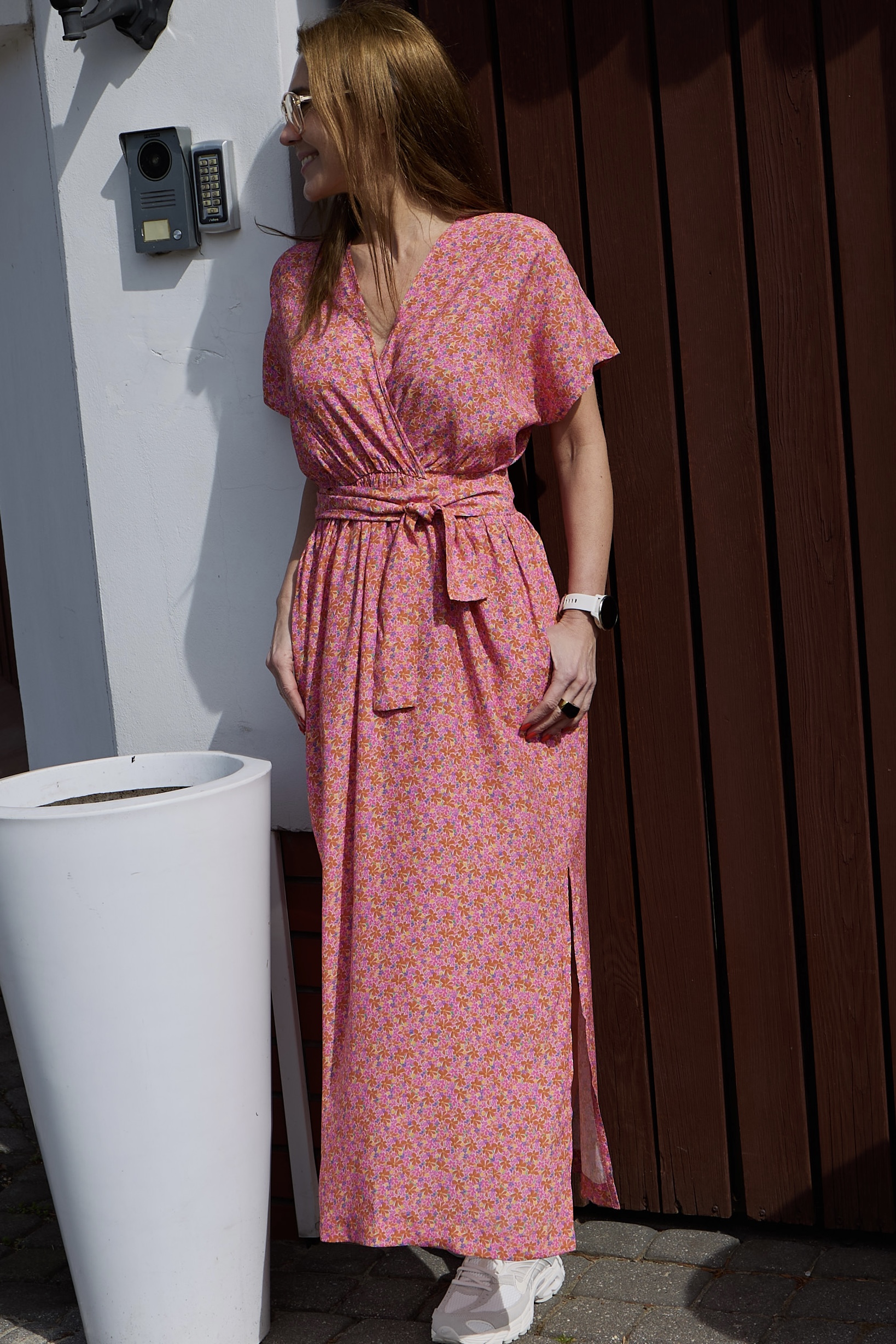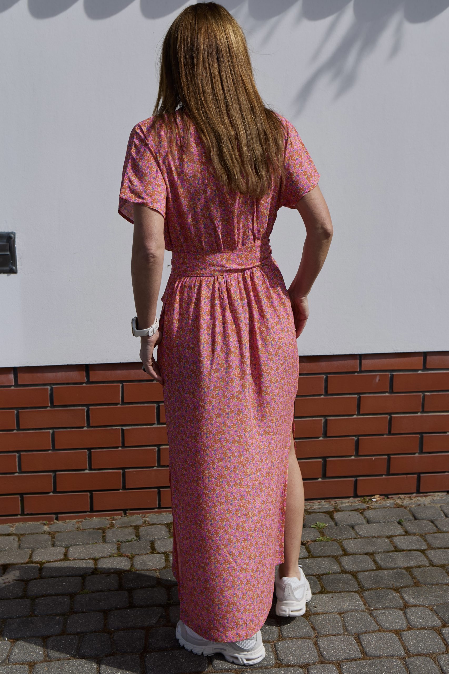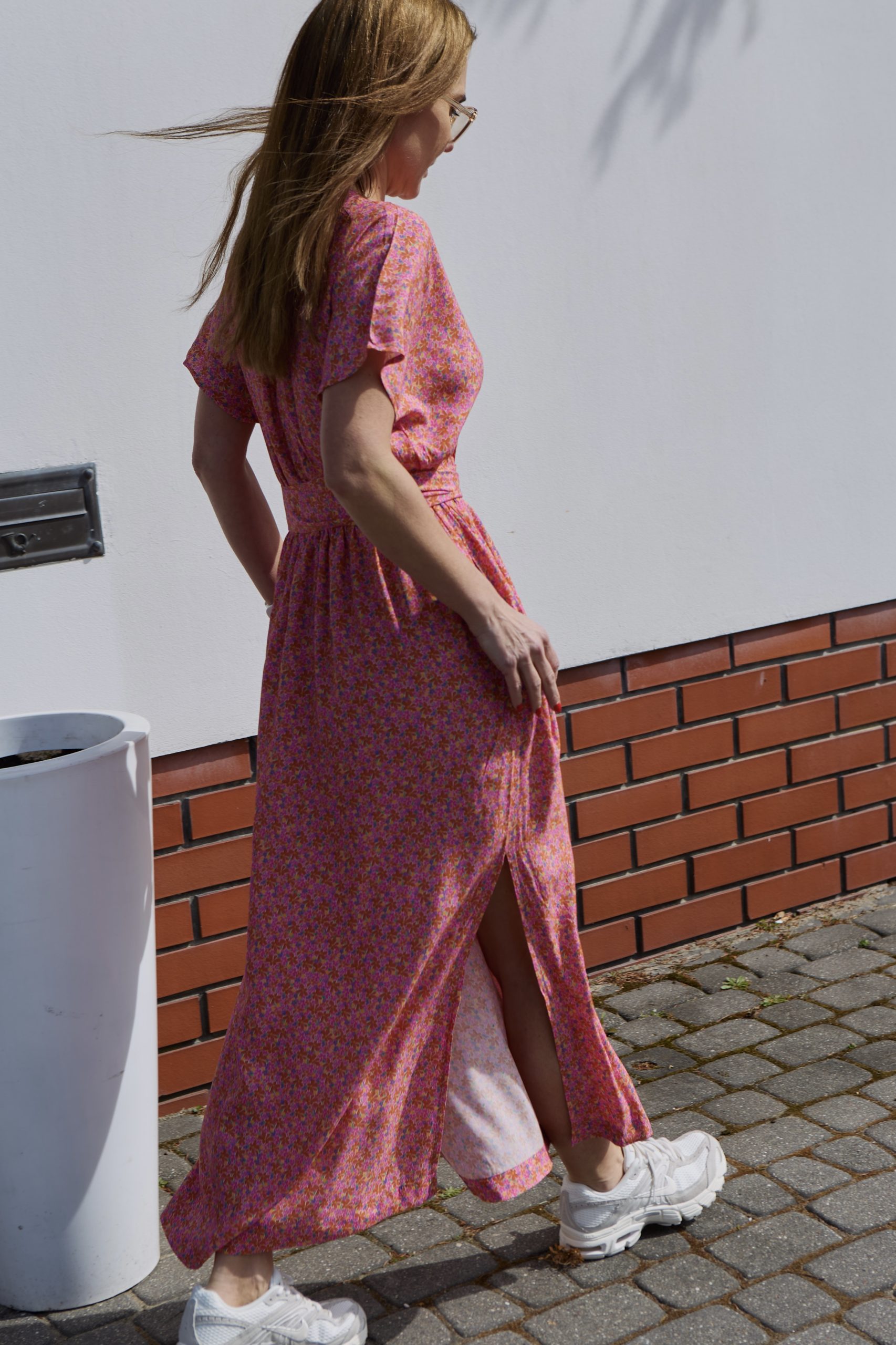 Sandi to wyjątkowo kobieca sukienka o długości do kostek, wykonana ze zwiewnej, szlachetnej wiskozy. Sukienka jest marszczona w talii (posiada gumę), do tego można przewiązać ją paskiem, który jest w komplecie. Można wykorzystać również inny dowolny pasek (np. pasek skórzany), który doda stylizacji bardziej formalny charakter. Sandi posiada kieszenie oraz dwa rozporki po bokach, które dodają sukience lekkości. Dekolt jest idealnie skrojony, przez co nie rozchodzi się na biuście. Rękaw jest krótki i kimonowy, co dodaje sukience jeszcze bardziej lekkiego charakteru. Do Sandi pasuje praktycznie każde obuwie – zarówno eleganckie szpilki jak i sportowe sneakersy lub casualowe espadryle, klapki. Sukienka występuje w dwóch rozmiarach: XS/S i M/L. Została uszyta w Polsce, w kameralnej pracowni na warszawskiej Pradze.